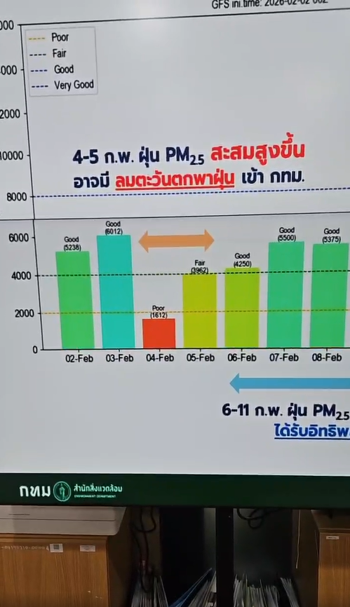 (4 ก.พ. 69) นายชัชชาติ สิทธิพันธุ์ ผู้ว่าราชการกรุงเทพมหานคร ติดตามสถานการณ์ฝุ่น PM2.5 ในพื้นที่กรุงเทพฯ ณ ศูนย์ข้อมูลคุณภาพอากาศกรุงเทพมหานคร สำนักสิ่งแวดล้อม เขตดินแดง โดยกล่าวว่า เช้านี้คุณภาพอากาศดี ส่วนใหญ่เป็นสีเขียวและมีสีเหลืองบ้าง เนื่องจากเมื่อวานอัตราการระบายอากาศดีมาก ส่วนวันนี้อัตราการระบายอากาศต่ำ อาจทำให้มีฝุ่นสะสมบ้าง ค่าฝุ่นอาจเป็นสีเหลืองและส้มในช่วงบ่ายถึงเย็น แต่พรุ่งนี้อัตราการระบายอากาศก็จะกลับมาดีขึ้นและดีไปตลอดสัปดาห์