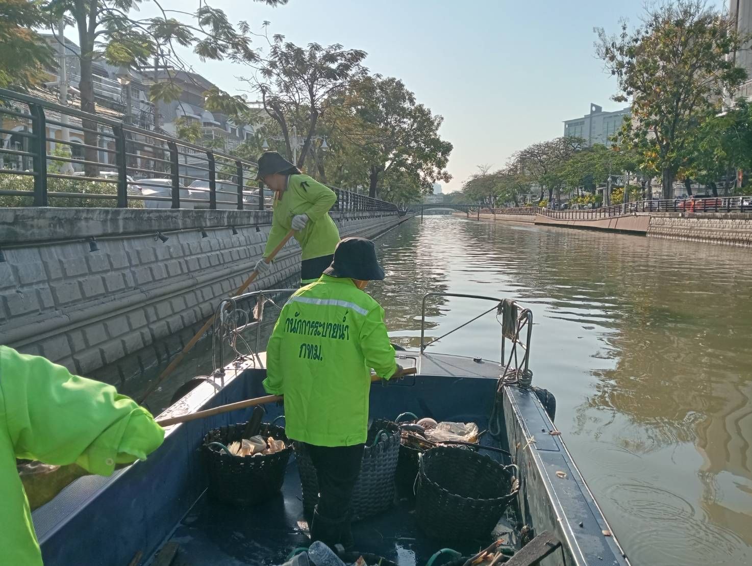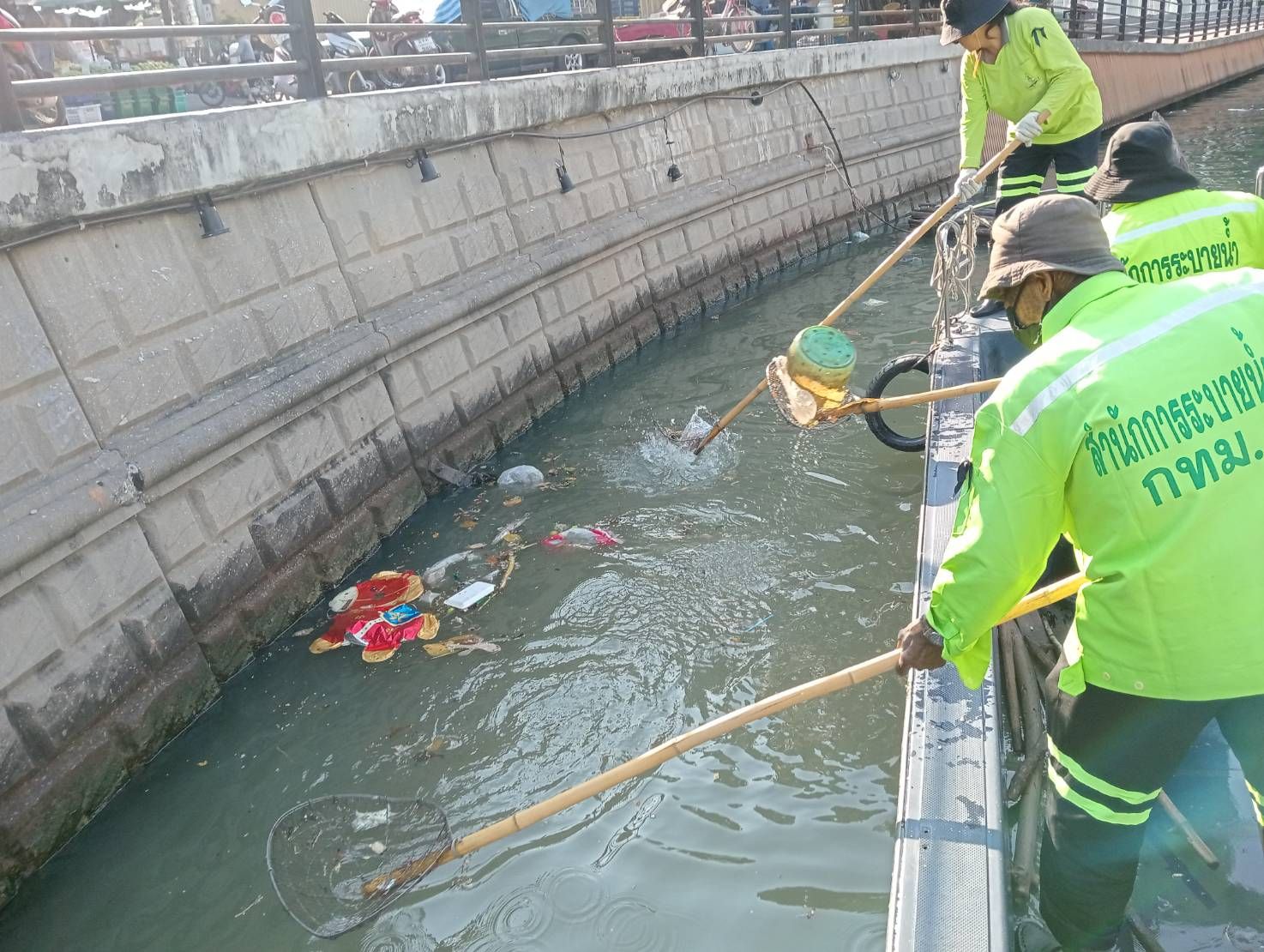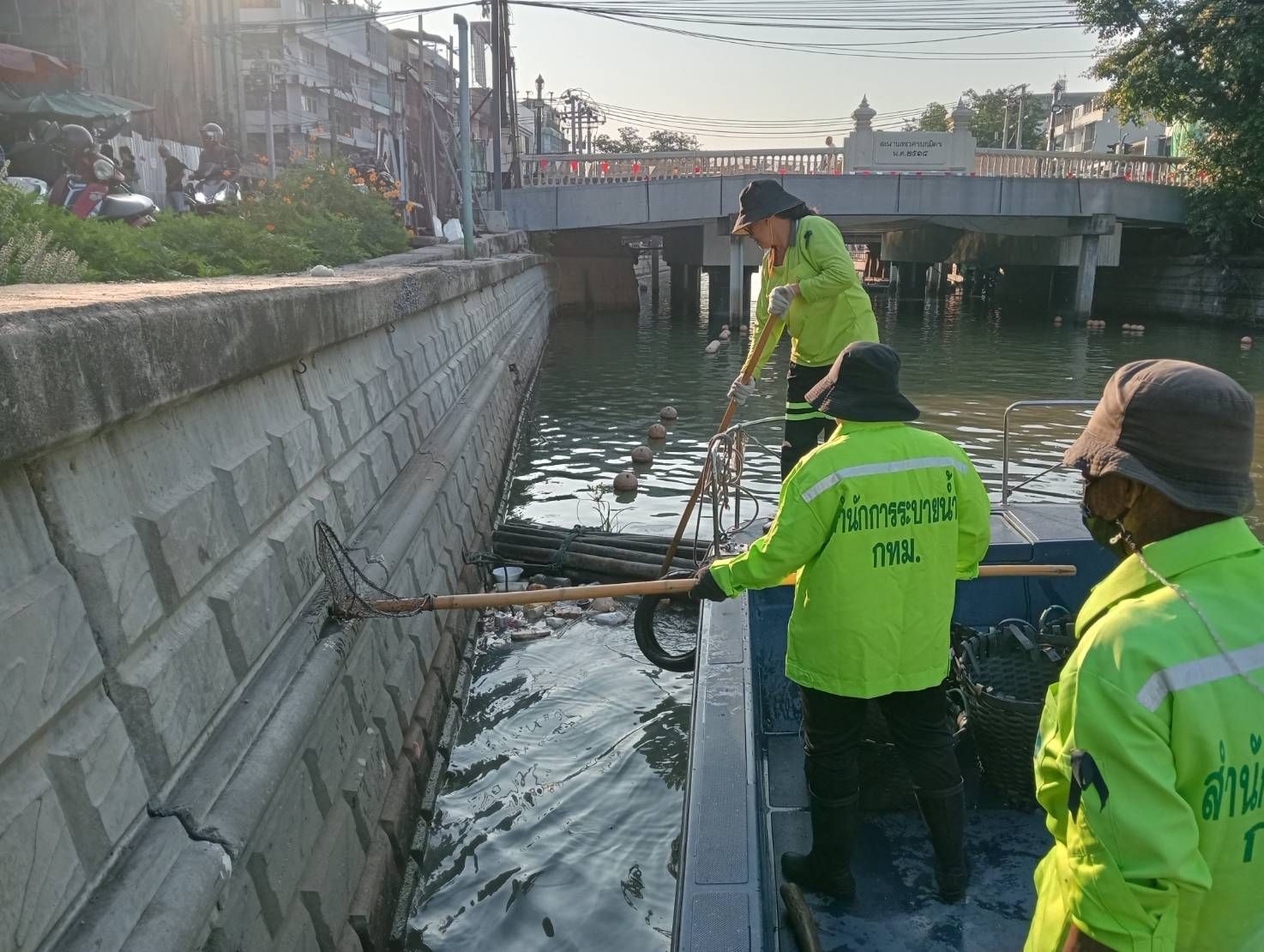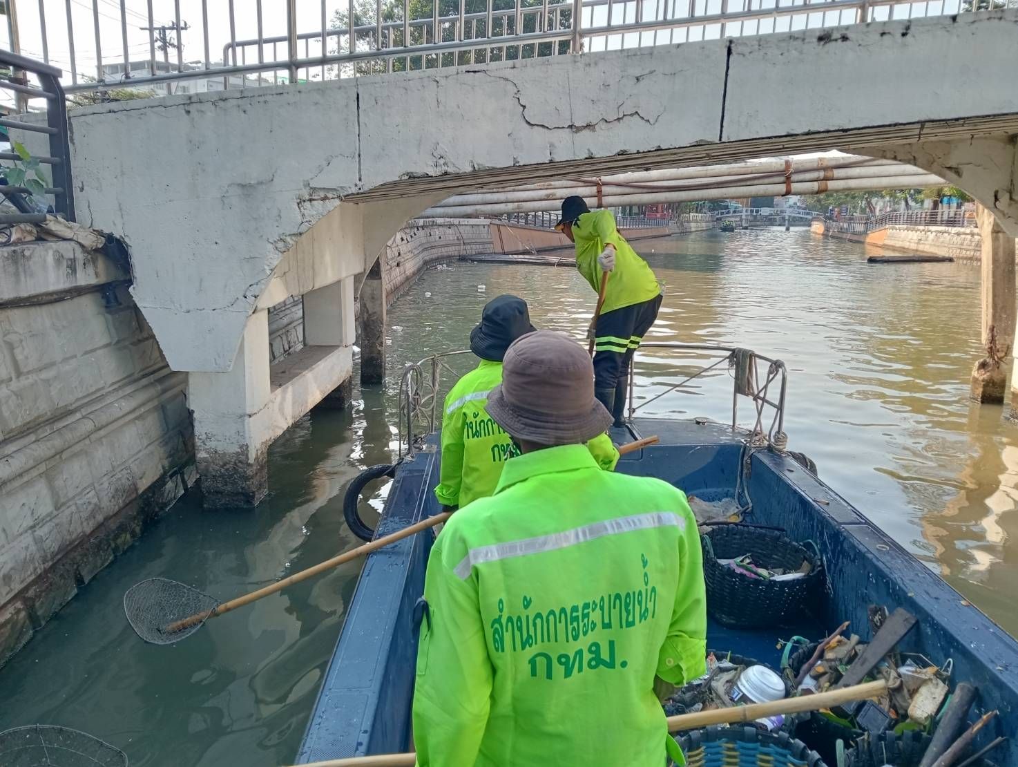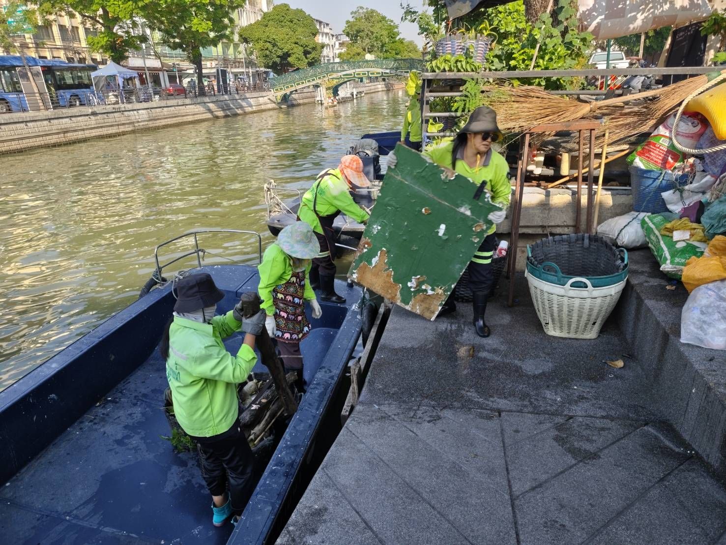 เจ้าหน้าที่ ตักเก็บขยะและวัชพืชเก็บจาก ปตร. เทเวศร์ตลอดช่วงสะพานมัฆวานถึงสี่แยกมหานาค เขตดุสิต เขตพระนคร เขตป้อมปราบศัตรูพ่าย