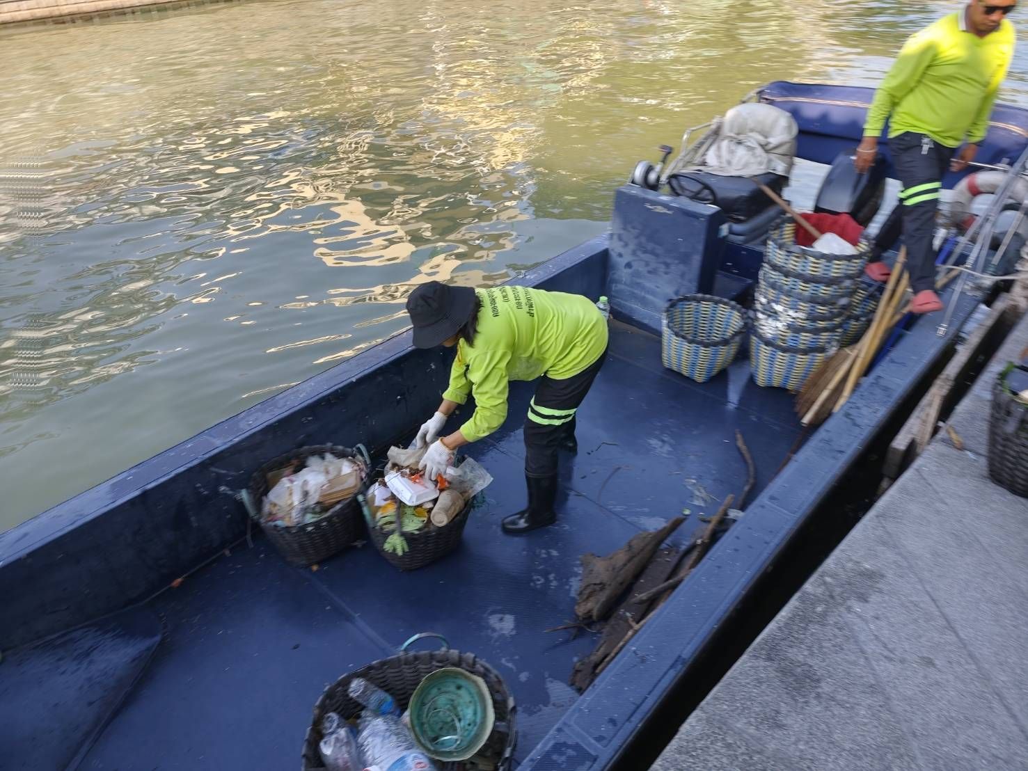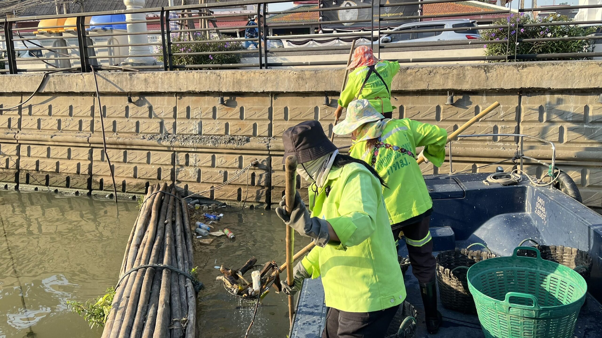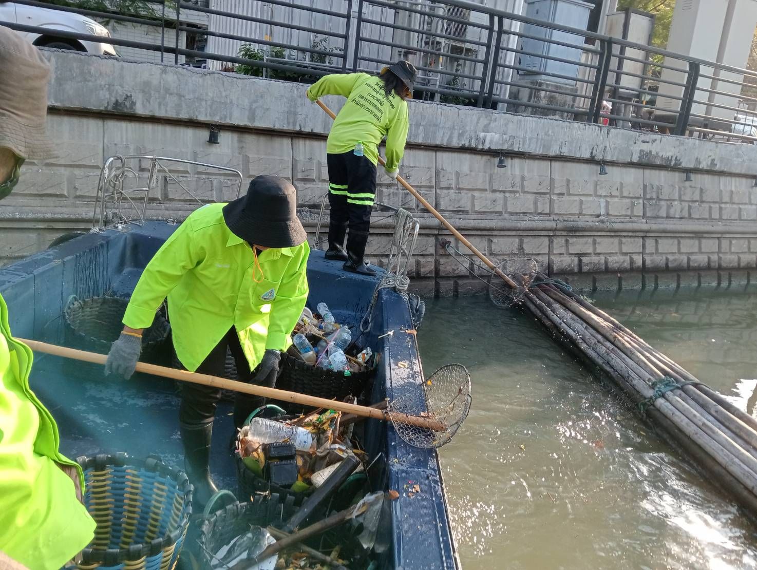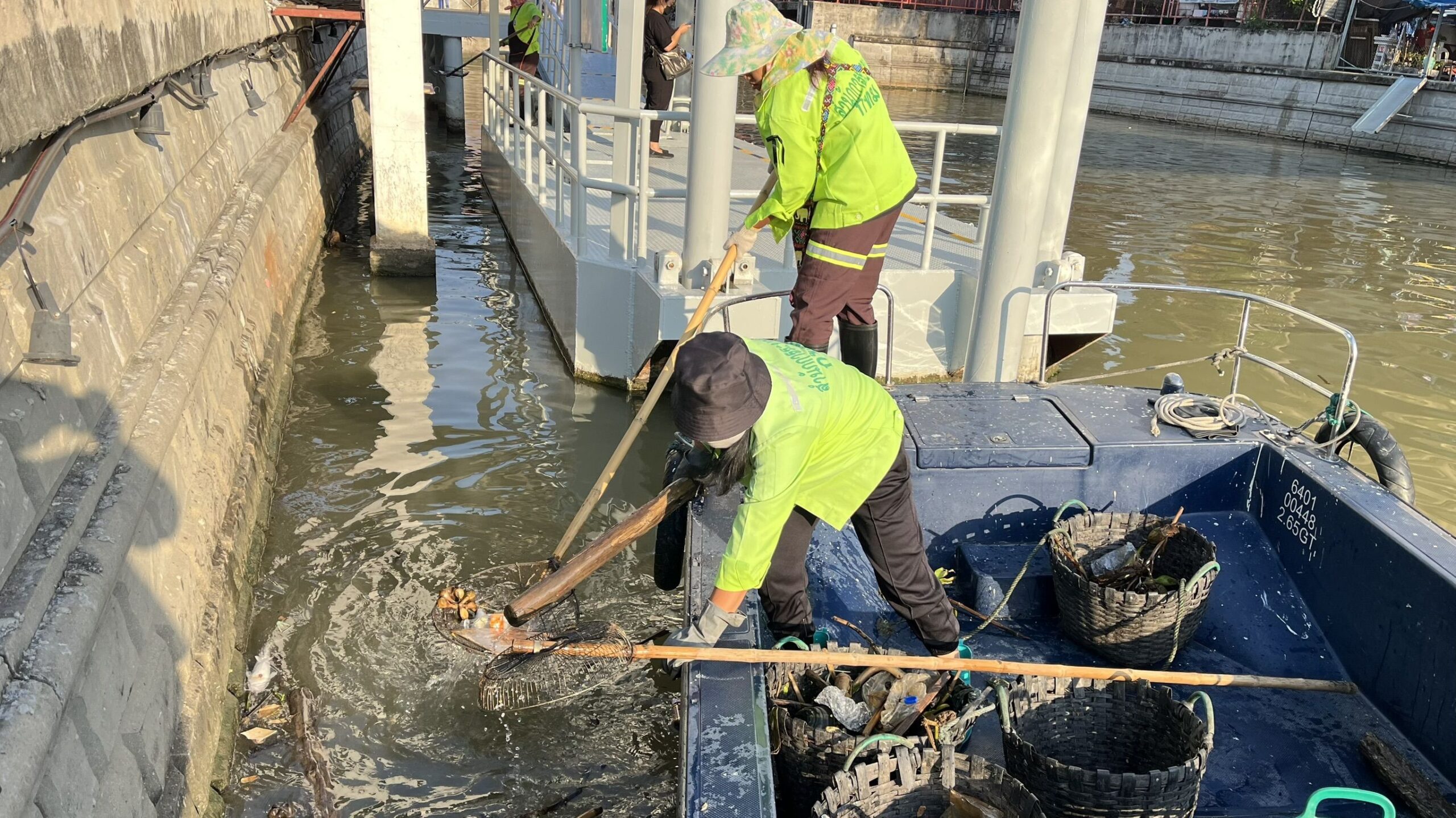 เจ้าหน้าที่ ตักเก็บขยะและวัชพืชเก็บจาก ปตร. เทเวศร์ตลอดช่วงสะพานมัฆวานถึงสี่แยกมหานาค เขตดุสิต เขตพระนคร เขตป้อมปราบศัตรูพ่าย