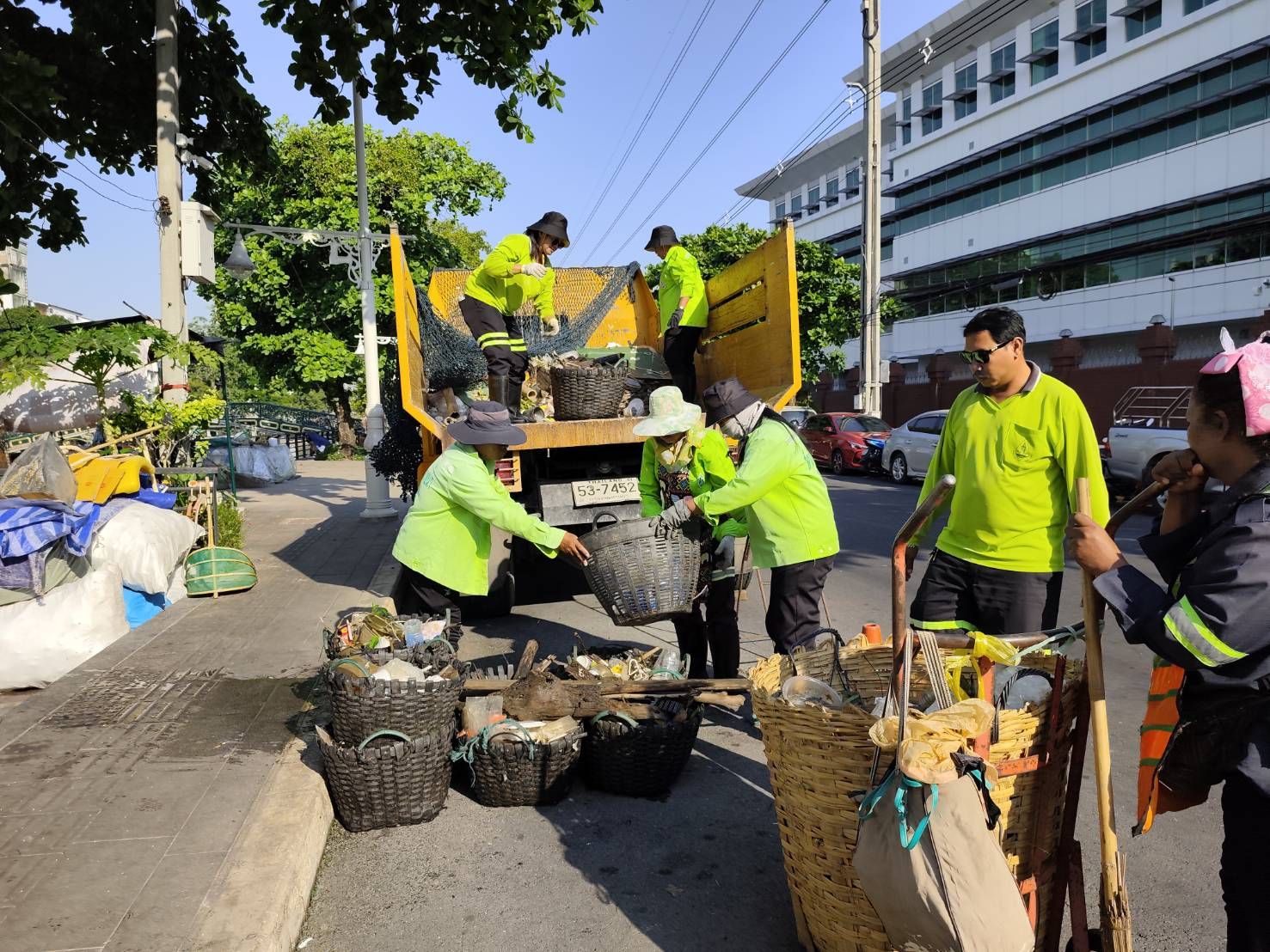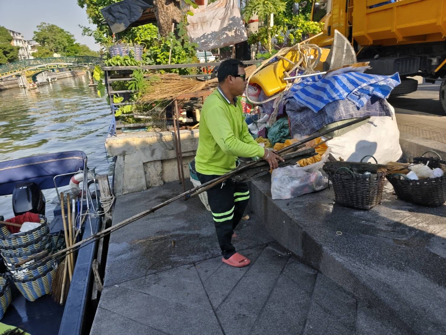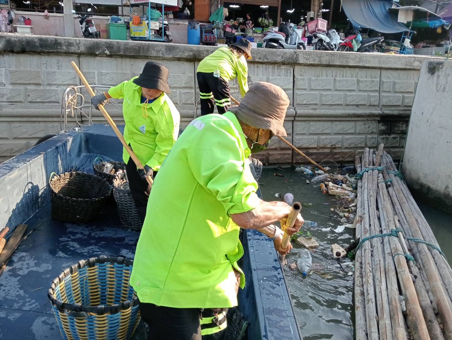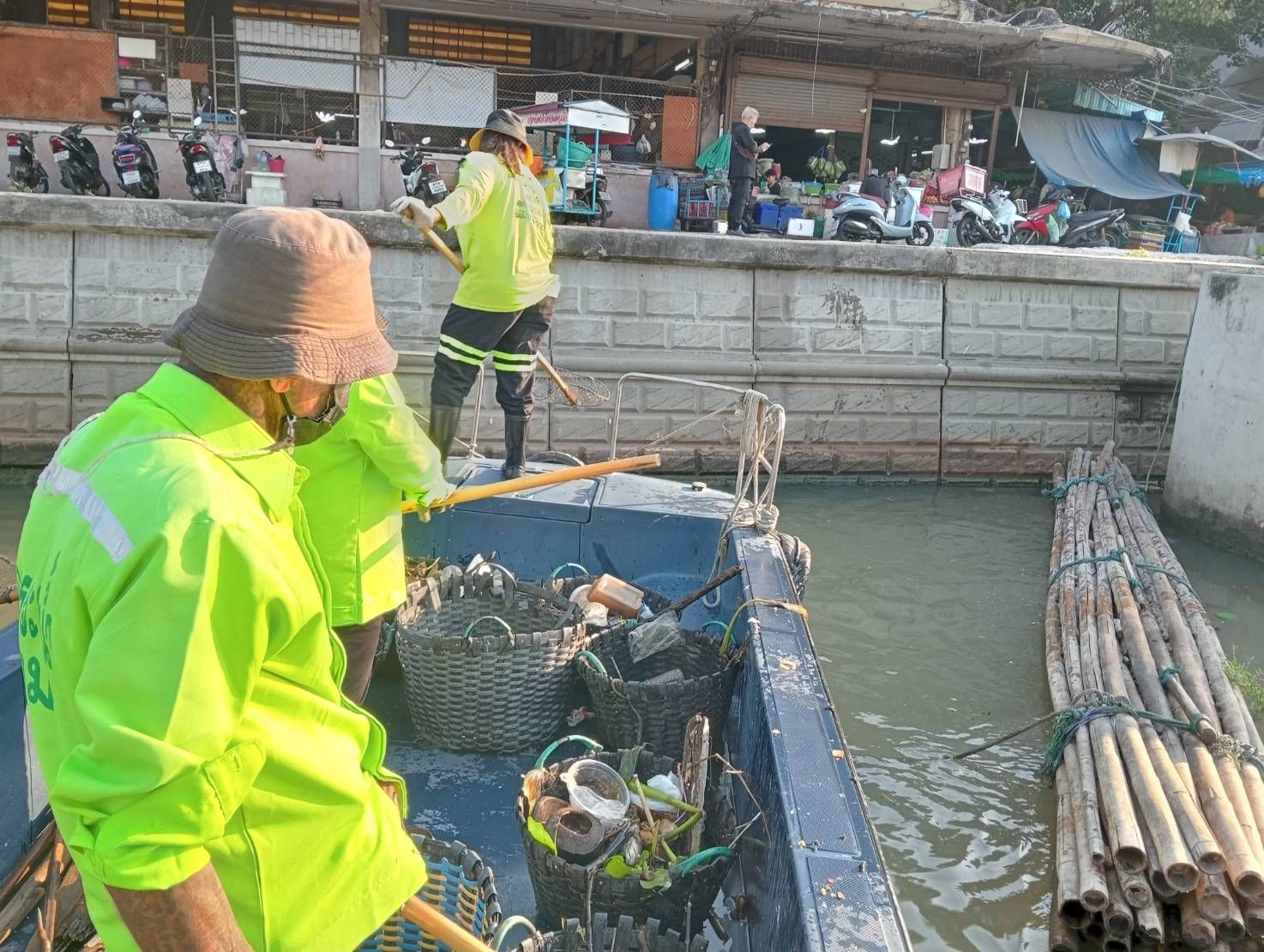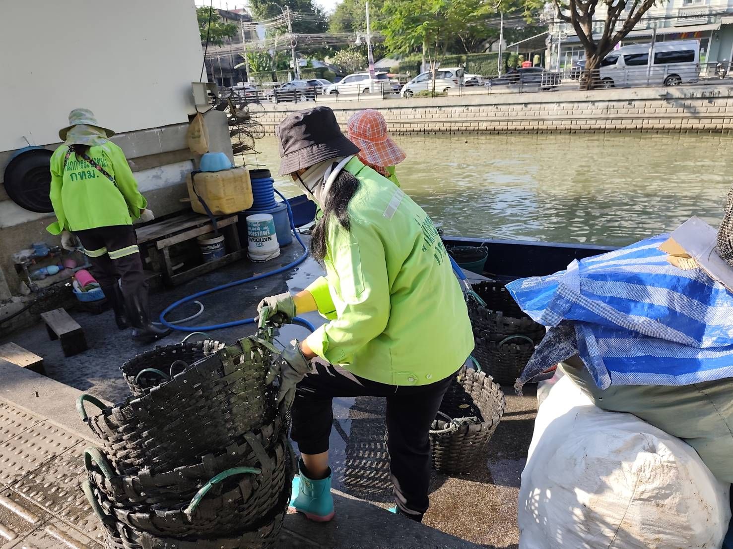เจ้าหน้าที่ ตักเก็บขยะและวัชพืชเก็บจาก ปตร. เทเวศร์ตลอดช่วงสะพานมัฆวานถึงสี่แยกมหานาค เขตดุสิต เขตพระนคร เขตป้อมปราบศัตรูพ่าย