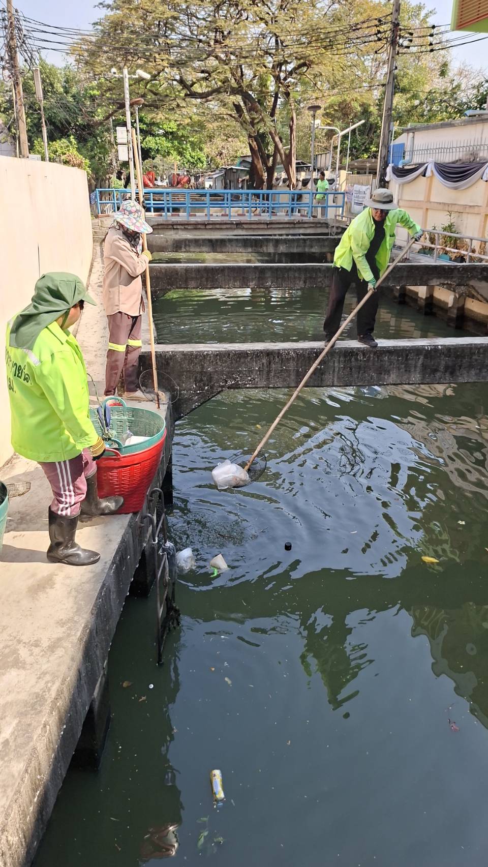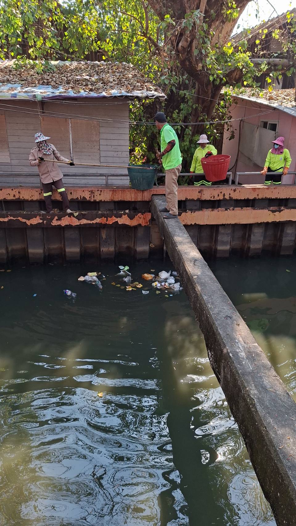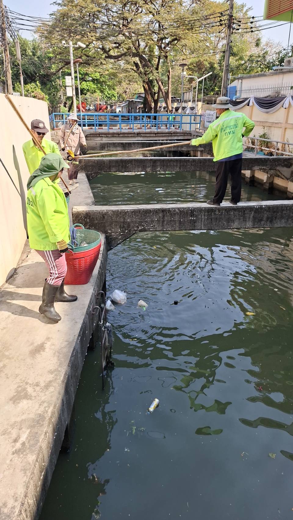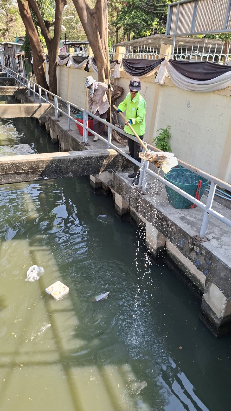 เจ้าหน้าที่ ตักขยะวัชพืชแพดักขยะหน้า ปตร.แสนเลิส แพดักขยะข้างวัดมักกะสัน พื้นที่เขตวัฒนา