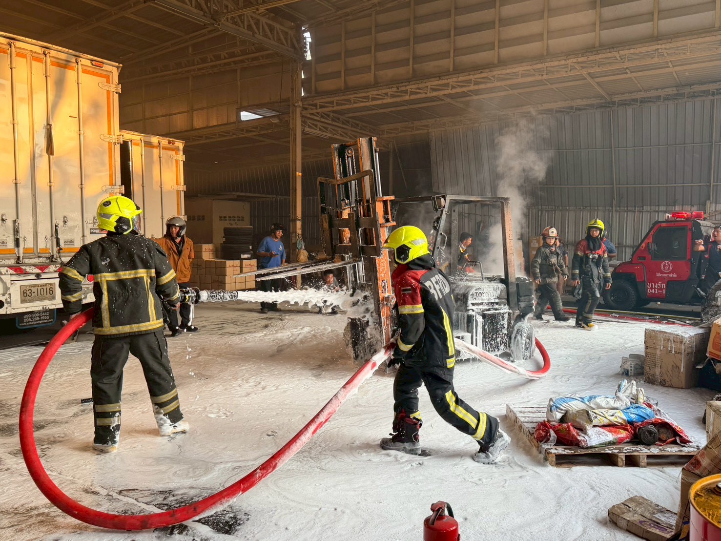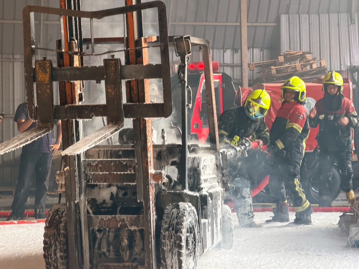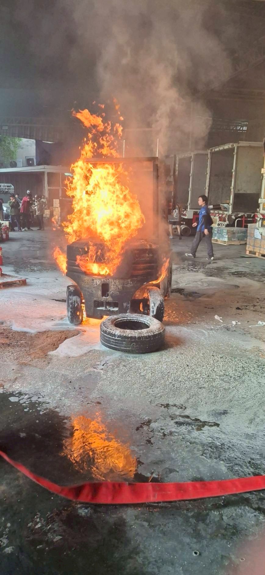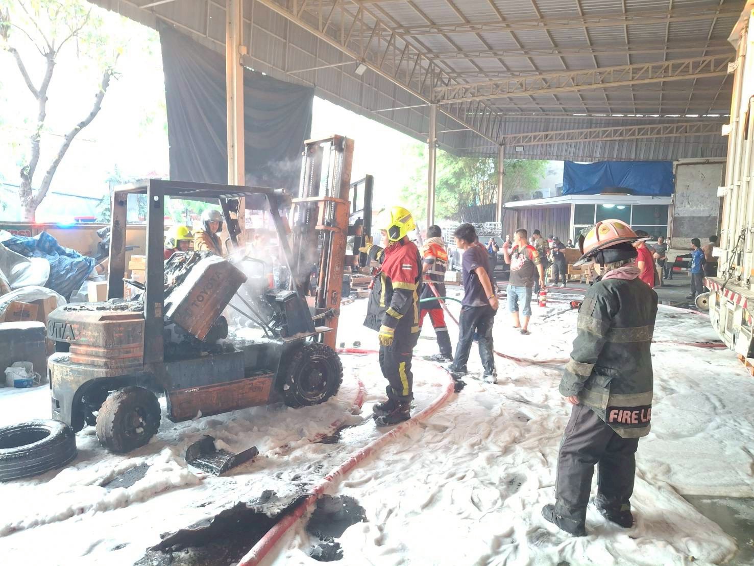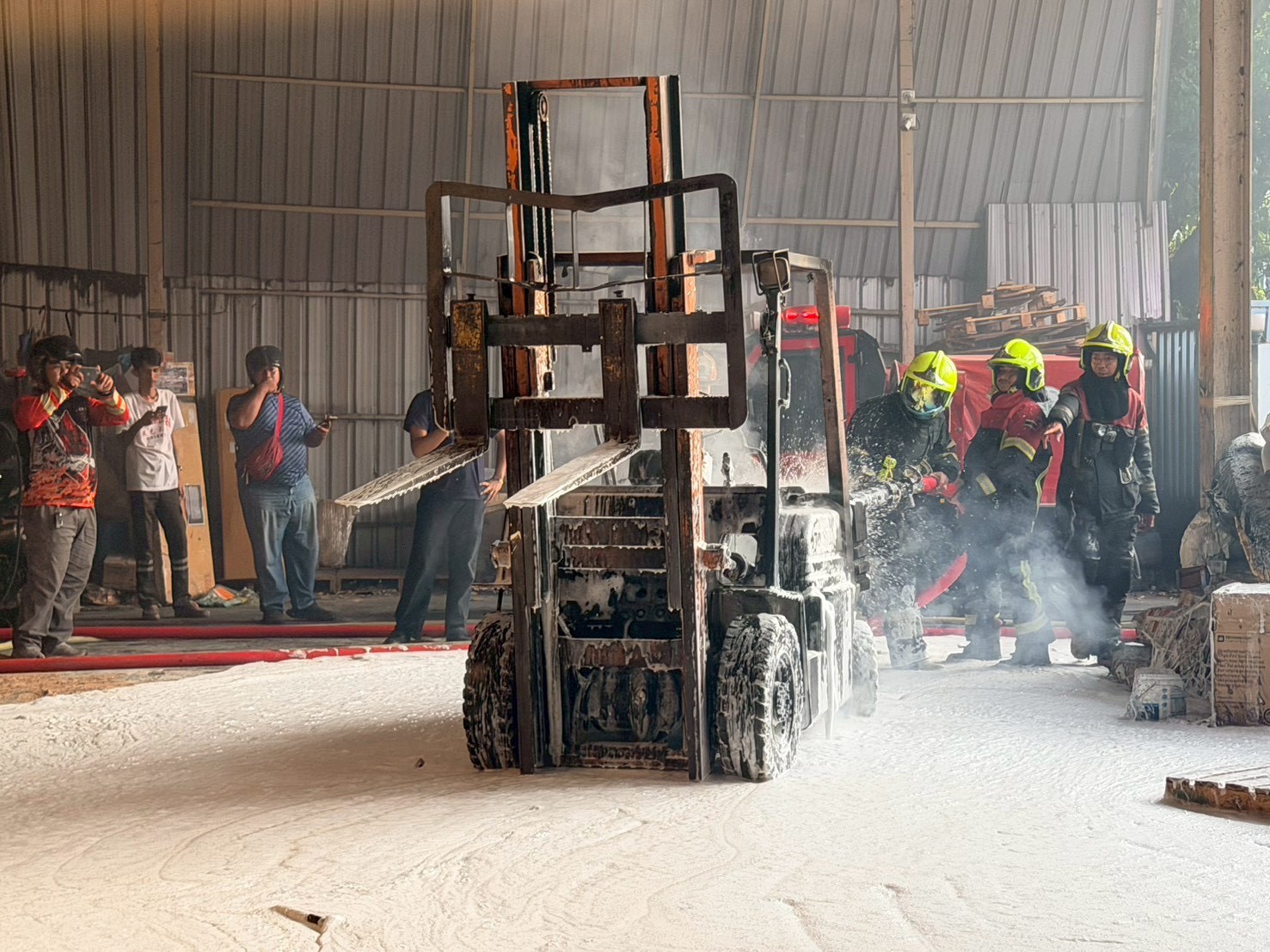 เหตุ 203 ไฟไหม้รถยนต์ โฟล์คลิฟท์ ใช้น้ำมันเบนซินเป็นเชื้อเพลิง เจ้าหน้าที่ ใช้ โฟมทำการดับ เพลิงสงบเป็นที่เรียบร้อย ไม่มีผู้ได้รับบาดเจ็บหรือเสียชีวิต มี ความเสียหายภายในห้องเครื่อง เบาะ สาเหตุ เกิดจากความร้อนภายในห้องเครื่อง เสียหายหมดทั้งคัน
