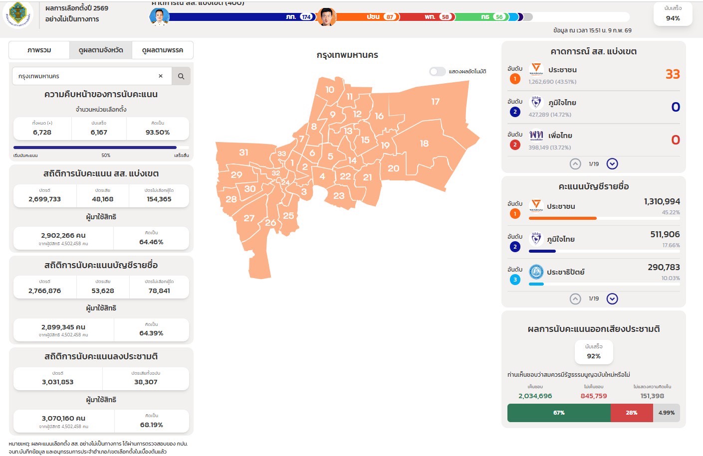 กรุงเทพมหานคร โดยสำนักงานปกครองและทะเบียน รายงานความคืบหน้าการนับคะแนนเลือกตั้งสมาชิกสภาผู้แทนราษฎร (สส.) และการออกเสียงประชามติอย่างไม่เป็นทางการ จากระบบ ECT Report ณ วันที่ 9 กุมภาพันธ์ 2569 เวลา 15.51 น. พบว่า การดำเนินงานในความรับผิดชอบของกรุงเทพมหานคร ครอบคลุมทั้ง 50 สำนักงานเขต (33 เขตเลือกตั้ง) เป็นไปด้วยความเรียบร้อยตามระเบียบและขั้นตอน