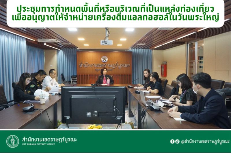 วันที่ 17 กุมภาพันธ์ 2569 เวลา 08.30 น. นางสาวสุวดี ไพอนนท์ ผู้อำนวยการเขตราษฎร์บูรณะ เป็นประธานการประชุมการกำหนดพื้นที่หรือบริเวณที่เป็นแหล่งท่องเที่ยวเพื่ออนุญาตให้จำหน่ายเครื่องดื่มแอลกอฮอล์ในวันพระใหญ่ ณ ห้องประชุมรักษ์เจ้าพระยา 2 ชั้น 7 สำนักงานเขตราษฎร์บูรณะ