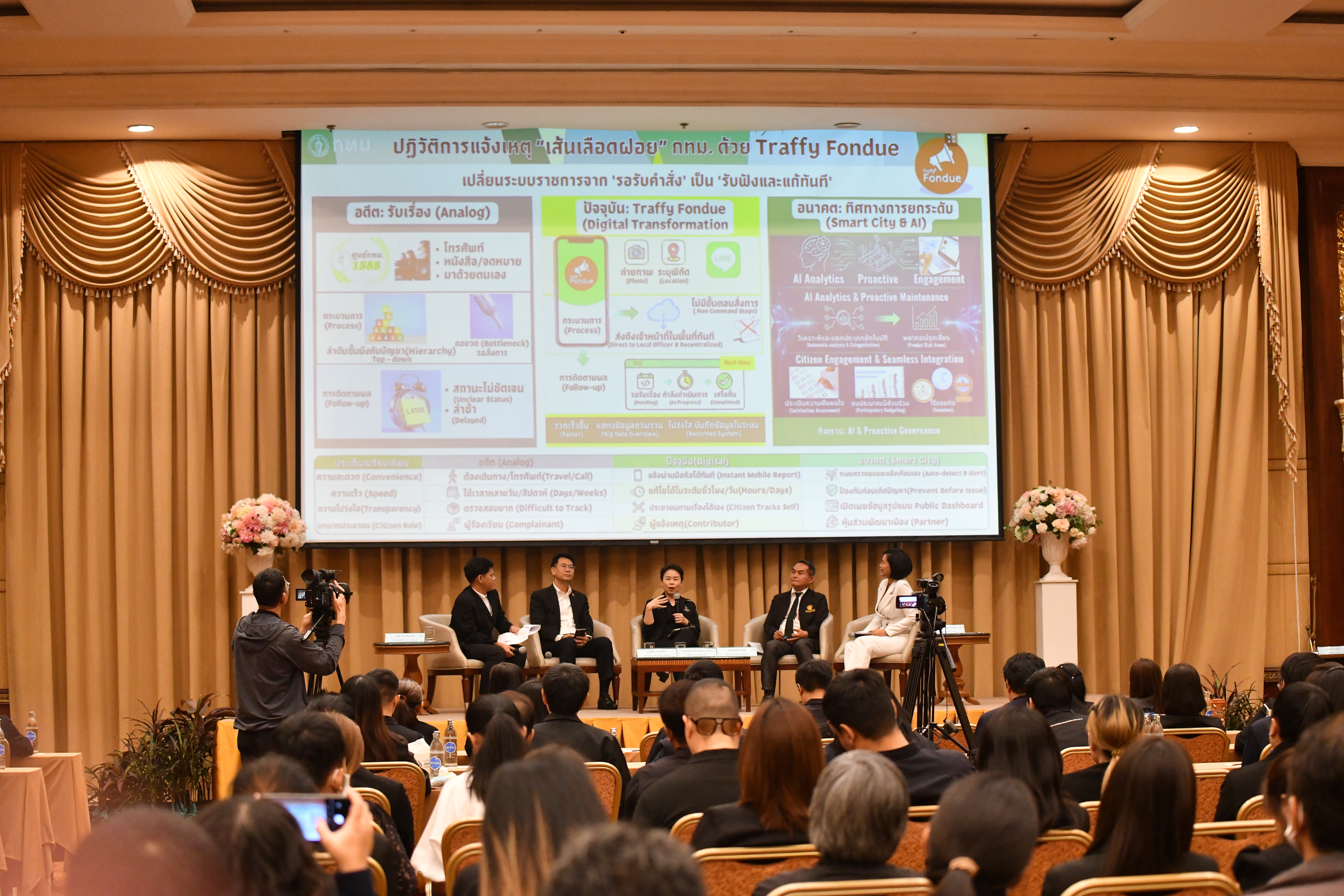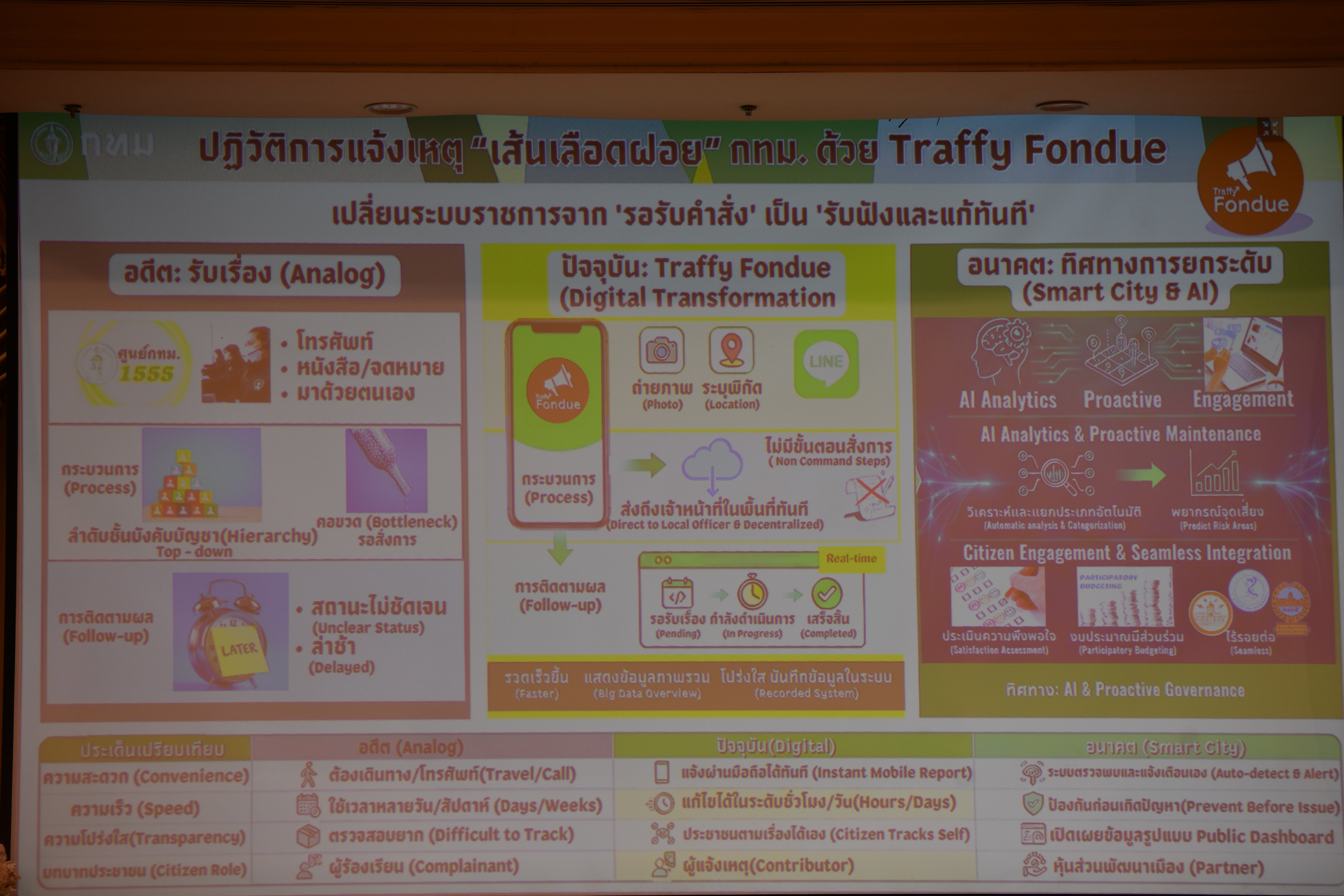 รองผู้ว่าฯ ทวิดา กล่าวว่า แนวทางการจัดการข้อร้องเรียนของ กทม. มีช่องทางที่หลากหลายเพื่อรองรับพฤติกรรมและความสะดวกที่แตกต่างกันของประชาชน ตั้งแต่การใช้ระบบอนาล็อกอย่างการลงพื้นที่ไปรับฟังปัญหาจากประชาชนโดยตรง ไปจนถึงการใช้สายด่วน 1555 และการนำเทคโนโลยีและแอปพลิเคชัน Traffy Fondue เข้ามาช่วยเพิ่มประสิทธิภาพในการจัดเก็บข้อมูล ทั้งหมดนี้มีเป้าหมายเพื่อให้ กทม. สามารถรับรู้และแก้ไขปัญหาได้ครอบคลุมทุกมิติ ทั้งนี้ การนำ Traffy Fondue มาใช้ ช่วยทลายข้อจำกัดด้านเวลา ทำให้ประชาชนสามารถแจ้งเหตุได้ตลอด 24 ชั่วโมง โดยไม่ต้องรอเวลาทำการ และช่วยลดภาระงานของเจ้าหน้าที่ในการบันทึกข้อมูล ความสำเร็จที่สำคัญคือการเปลี่ยนข้อมูลจากประชาชนให้กลายเป็นแผนที่ปัญหา เช่น การระบุจุดเสี่ยงน้ำท่วมที่เพิ่มขึ้นจากหลักสิบสู่หลักร้อยจุด ซึ่งช่วยให้การบริหารจัดการงบประมาณและกำลังคนทำได้อย่างตรงจุดและรวดเร็วกว่าเดิม ดังนั้น เทคโนโลยีไม่ใช่เพียงแค่เครื่องมือสื่อสาร แต่คือระบบติดตามและประเมินผลที่ช่วยยกระดับประสิทธิภาพในการแก้ปัญหาให้แก่ประชาชน