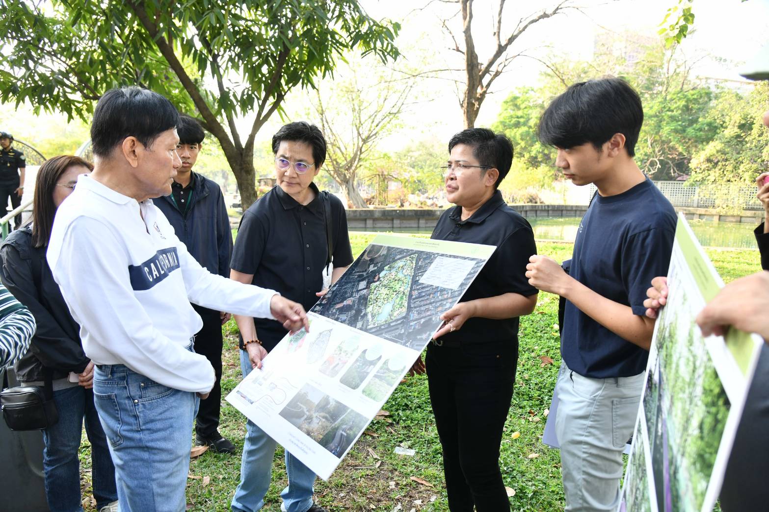 Central to the project’s technical design is the “Blue-Green” concept, which integrates sustainable water management with urban greenery. The garden is being engineered to function as a natural flood-control reservoir, capable of managing rainwater and floodwater while simultaneously improving water quality through natural filtration processes using aquatic plants. This approach allows urban residents to coexist with nature in a balanced and sustainable manner. Infrastructure improvements also include the development of wetland treatment areas, ecological forests, and nature trails, alongside the construction of four modern public restrooms, totaling 26 stalls, to ensure public convenience. During the visit, Deputy Governor Chakkaphan emphasized the importance of cost-effective budget allocation, instructing officials to finalize technical details for lighting and irrigation systems while ensuring that safety measures, such as clear informational signage and temporary closures, are strictly maintained during the renovation to minimize disruption for current park users.