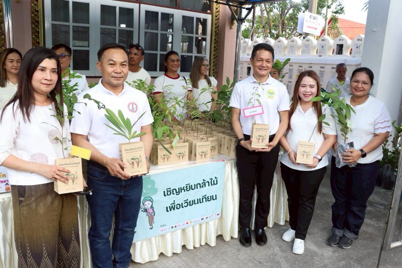 >> ในการนี้ เจ้าหน้าที่ฝ่ายรักษาความสะอาดและสวนสาธารณะ ได้นำต้นไม้🪴🌱มาแจกให้ประชาชนได้นำไปเวียนเทียน🕯 และนำกลับไปปลูกที่บ้านได้ ฟรี!! ไม่มีค่าใช้จ่าย👍 🌳🌳 โดยแจกกล้าไม้ จำนวน 700 ต้น ได้แก่ 1.มะฮอกกานี 150 ต้น 2.ทองอุไร 150 ต้น 3.มะขาม 100 ต้น 🌳🌱4.ละมุดสีดา 100 ต้น 5.อโศกอินเดีย 100 ต้น และ 6.พิกุล 100 ต้น