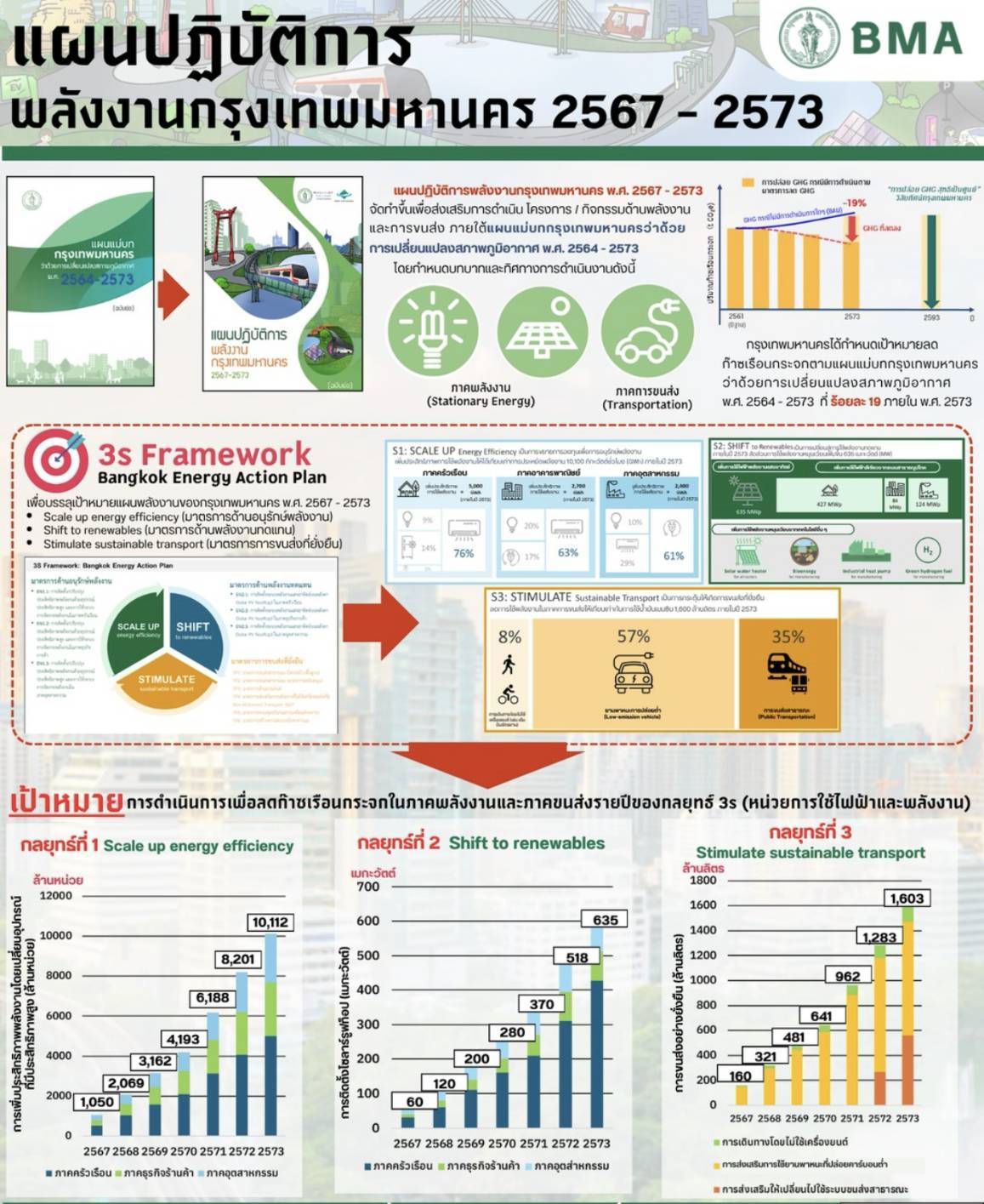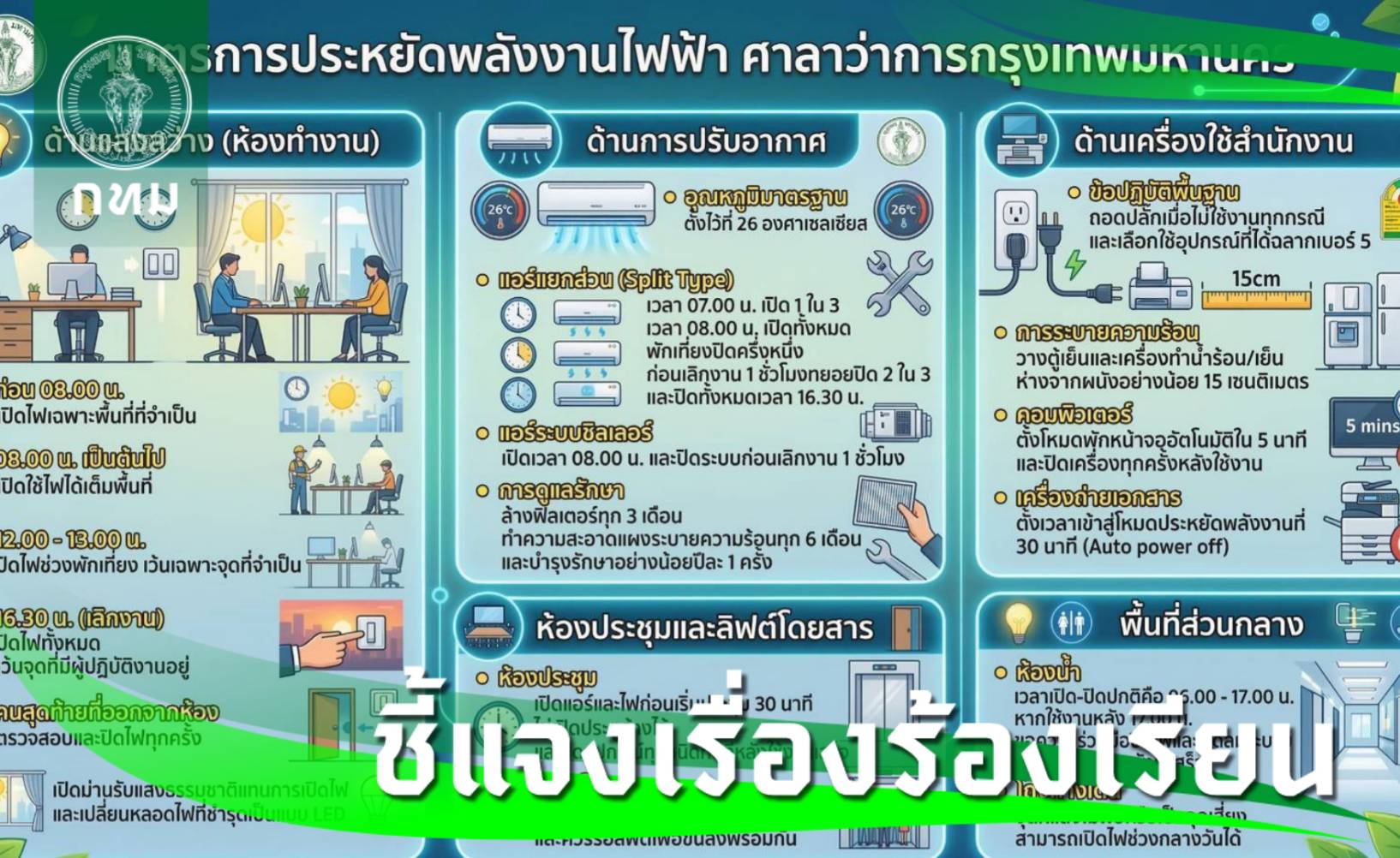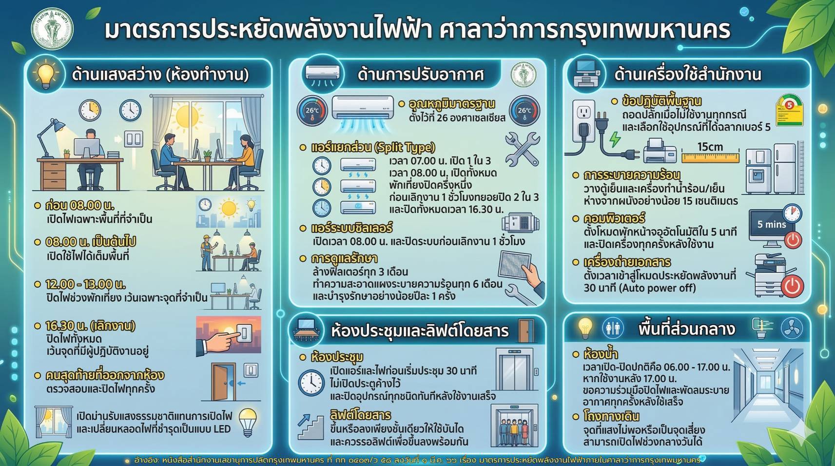 นางสาววรนุช สวยค้าข้าว ผู้อำนวยการสำนักสิ่งแวดล้อม (สสล.) กทม. กล่าวถึงแนวทางการดำเนินการ เพื่อรองรับสถานการณ์ราคาพลังงานโลกที่มีความผันผวนตามมติของคณะรัฐมนตรี และการประสานความร่วมมือหน่วยงานในสังกัด กทม. ดำเนินมาตรการลดการใช้พลังงานในหน่วยงานภาครัฐตามแนวทางของกระทรวงพลังงาน โดยเฉพาะการขับเคลื่อนแผนปฏิบัติการลดการใช้พลังงานของหน่วยงานในสังกัด กทม. ในปีงบประมาณ พ.ศ. 2569 ว่า สสล. ได้บูรณาการการดำเนินงานร่วมกับทุกภาคส่วนอย่างต่อเนื่อง เพื่อลดการใช้พลังงานของกรุงเทพมหานคร ให้สอดคล้องกับมติคณะรัฐมนตรี เมื่อวันที่ 22 มี.ค. 65 ซึ่งอนุมัติหลักการให้หน่วยงานราชการดำเนินการตามข้อเสนอของกระทรวงพลังงานลดการใช้พลังงาน ร้อยละ 20 โดยจัดทำแผนปฏิบัติการพลังงานกรุงเทพมหานคร พ.ศ. 2567-2573 กำหนดกรอบการดำเนินงานในการลดก๊าซเรือนกระจกภาคพลังงานและภาคขนส่ง เพื่อส่งเสริมการมีส่วนร่วมจากหน่วยงานที่เกี่ยวข้องทั้งภาครัฐ ภาคเอกชน และภาคประชาชน มีกลยุทธ์ ในการดำเนินการแบ่งเป็น 3 ด้าน ประกอบด้วย การเพิ่มประสิทธิภาพการใช้พลังงาน การใช้พลังงานทดแทน และการขนส่งที่ยั่งยืนสำหรับหน่วยงานในสังกัด กทม. ได้ดำเนินการตามแนวทางการปฏิบัติงานในที่พัก (Work From Home) โดยสำนักงานคณะกรรมการข้าราชการกรุงเทพมหานคร (ก.ก.) มีหนังสือด่วนที่สุด ที่ กท 0305/ว 53 ลงวันที่ 10 มี.ค. 69 ให้ทุกหน่วยงานทราบและถือปฏิบัติ ตามหนังสือสำนักงาน ก.ก. กท 0303/786 ลงวันที่ 5 เม.ย. 66 พร้อมกันนี้ สสล. ได้ประสานความร่วมมือส่งเสริมการดำเนินการลดการใช้พลังงานในหน่วยงานสังกัด กทม. ผ่านโครงการ/กิจกรรมต่าง ๆ ได้แก่ (1) การจัดทำคาร์บอนฟุตพริ้นขององค์กร เพื่อให้หน่วยงานทราบสถานะ การใช้พลังงานและการปล่อยก๊าซเรือนกระจกของหน่วยงาน และสามารถนำข้อมูลไปใช้ประกอบการวางแผน การลดการใช้พลังงานและลดการปล่อยก๊าซเรือนกระจกของหน่วยงานได้อย่างมีประสิทธิภาพ และ (2) การดำเนินงานสำนักงานสีเขียว กทม. และการลดการใช้พลังงานในอาคารควบคุมของหน่วยงาน กทม. ซึ่งเป็นการส่งเสริมให้หน่วยงานสังกัดดำเนินการตามมาตรการและแนวทางการลดการใช้พลังงาน พร้อมรวบรวมรายงานข้อมูล รวมทั้งใช้ข้อมูลในการวางแผนและกำหนดเป้าหมายการลดการใช้พลังงานของหน่วยงานอย่างต่อเนื่องและเหมาะสม ซึ่งมีมาตรการและแนวทาง เช่น ด้านการใช้ไฟฟ้า (ปิดไฟช่วงพักกลางวันและเมื่อไม่ใช้งาน บำรุงรักษาอุปกรณ์อย่างสม่ำเสมอ การใช้แสงธรรมชาติช่วยในการลดการใช้พลังงานจากแสงไฟ), การใช้เครื่องปรับอากาศ (ตั้งอุณหภูมิไว้ที่ 26 องศาเซลเซียส เปลี่ยนเครื่องปร