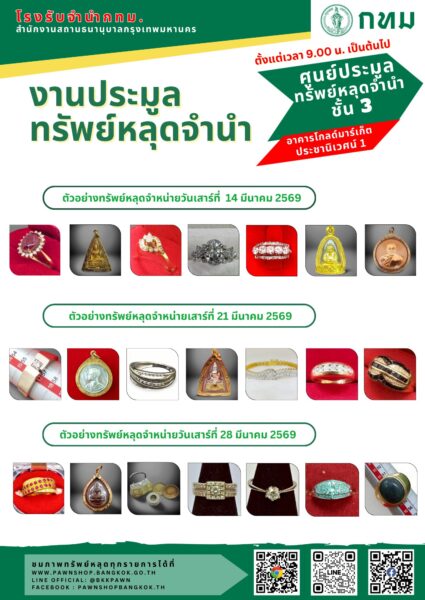สำนักงานสถานธนานุบาลกรุงเทพมหานคร จึงขอเชิญชวนประชาชนที่มีความสนใจทรัพย์หลุดจำนำดังกล่าว เข้าร่วมการประมูลทรัพย์หลุดจำนำ โดยวิธีการประมูลด้วยวาจา ทั้งนี้สามารถชำระเงินได้หลายช่องทาง เช่น ชำระเป็นเงินสด หรือโอนเงินผ่าน QR CODE หรือชำระเงินผ่านบัตรเดบิต ซึ่งจะไม่มีค่าธรรมเนียม ยกเว้นกรณีชำระเงินด้วยบัตรเครดิต (ค่าธรรมเนียม 1%) ตั้งแต่เวลา 09.00 น. เป็นต้นไป ณ สำนักงานสถานธนานุบาลกรุงเทพมหานคร ห้องประมูลทรัพย์หลุดจำนำ ชั้น 3 อาคารโกลด์ มาร์เก็ต เลขที่ 8 ถนนเทศบาลสงเคราะห์ แขวงลาดยาว เขตจตุจักร กรุงเทพมหานคร ในวันที่ 14, 21 และ 28 มีนาคม 2569