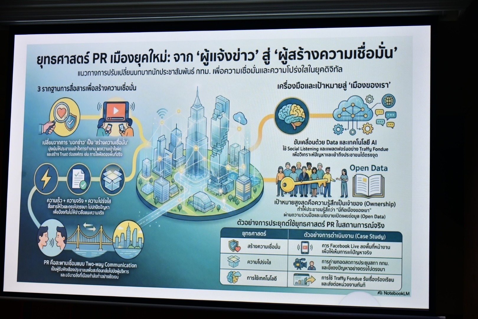 รองปลัดกรุงเทพมหานคร กล่าวว่า อยากให้เห็นความสำคัญของทีมประชาสัมพันธ์เพราะมีความสำคัญมาก ไม่ใช่แค่การบอกเรื่องราวและสื่อออกไปแต่เป็นการสร้างความเชื่อมั่นต่อประชาชน เพื่อให้รู้ว่า กทม. ทำอะไรไปแล้วบ้าง ในส่วนของงานที่จะต้องทำคือสร้างความเชื่อถือ สร้างความมั่นใจให้ประชาชน เพราะการประชาสัมพันธ์ให้ประชาชนได้เห็นว่าเมืองกำลังทำอะไร ทำแล้วมีผลกับประชาชนอย่างไร ประชาชนจะมีส่วนร่วมกับเมืองได้อย่างไร เป็นสิ่งสำคัญมากที่อยากให้ทุกคนช่วยกัน ทั้งนี้ ในการสื่อสาร City Communications Model มี 5 E ได้แก่ 1. Explain คือ การอธิบายให้ประชาชนรู้ว่าเราทำไปเพื่ออะไร ด้วยภาษาที่เข้าใจง่าย ไม่ใช้ภาษาราชการที่ซับซ้อน 2. Evidence ต้องมีหลักฐานชัด 3. Empathy ต้องเข้าใจประชาชน รู้ว่าประชาชนมีปัญหาอะไร แล้วดึงปัญหามาพูดให้เห็นว่าเราอยู่ฝั่งประชาชน 4. Engagement การทำให้ประชาชนมีส่วนร่วม 5. Empowerment การทำให้เห็นภาพว่าประชาชนทำได้ ถ้าประชาชนไม่ทำมันจะไม่เกิด ทำให้เห็นภาพว่ากรุงเทพมหานครเป็นเมืองของประชาชน เมืองจะดีได้เพราะประชาชนช่วยกันดูแล กทม.กับประชาชนเป็นทีมเดียวกัน ทำงานด้วยกัน ไปด้วยกัน