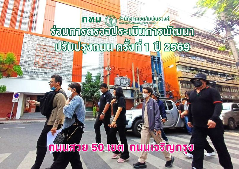 16 มี.ค.2569 เวลา 9.00 น.นายธนาเดช จันทร์แก้ว ผู้อำนวยการเขตสัมพันธวงศ์ มอบหมายนางสาวชัญญาภัค ชำนิกล้า ผู้ช่วยผู้อำนวยการเขต ผู้บริหารเขต และเจ้าหน้าที่เขต ร่วมการตรวจประเมินการพัฒนาปรับปรุงถนน ครั้งที่ 1 ตามตัวชี้วัดองค์ประกอบที่ 1 การประเมินประสิทธิภาพผลการดำเนินงาน (Performance Base) ประจำปีงบประมาณ พ.ศ.2569 ตัวชี้วัดผลหลัก KR 41103 พัฒนาถนนสวย 50 เขต กับสำนักยุทธศาสตร์และประเมินผล สำนักการโยธา และสำนักการจราจรและขนส่ง ณ ถนนเจริญกรุง