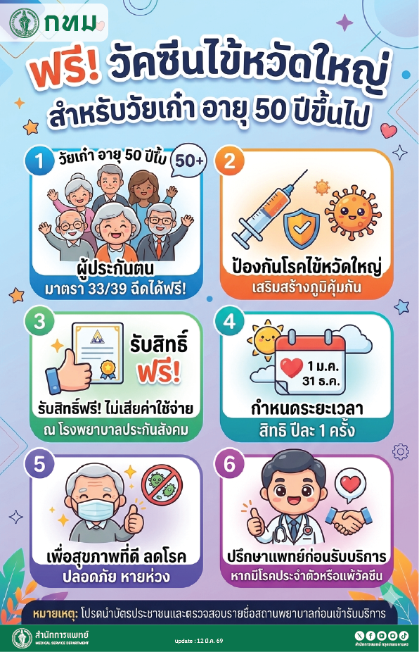 สำหรับการให้บริการวัคซีนป้องกันไข้หวัดใหญ่ ได้เปิดให้บริการฉีดวัคซีนป้องกันไข้หวัดใหญ่แก่ประชาชนในพื้นที่กรุงเทพฯ สำหรับผู้ประกันตน มาตรา 33 และมาตรา 39 สิทธิประกันสังคมสำหรับผู้ที่อายุมากกว่า 50 ปีขึ้นไป ชนิด 3 สายพันธุ์ กำหนดสิทธิ ปีละ 1 ครั้ง ตั้งแต่วันที่ 1 ม.ค.-31 ธ.ค. 69 หรือจนกว่าวัคซีนจะหมด ณ สถานพยาบาลตามสิทธิการรักษาพยาบาลที่สำนักงานประกันสังคมกำหนด ซึ่งกลุ่มเสี่ยงโรคไข้หวัดใหญ่ที่ต้องเฝ้าระวัง คือ เด็กที่มีอัตราการป่วยสูงและผู้สูงอายุ ผู้มีโรคประจำตัวที่มีความเสี่ยงอาการรุนแรงและเสียชีวิต จึงขอเน้นย้ำให้สวมหน้ากากอนามัยทุกครั้งเมื่อใกล้ชิดกลุ่มผู้สูงอายุ ผู้มีโรคประจำตัว และเด็กเล็ก ส่วนผู้ที่เป็นกลุ่มเสี่ยง ให้ป้องกันตนเองด้วยการสวมหน้ากากอนามัย ล้างมือด้วยสบู่และน้ำบ่อย ๆ หลีกเลี่ยงเข้าไปในพื้นที่เสี่ยง เช่น โรงพยาบาล สถานที่แออัด หลีกเลี่ยงการสัมผัสใกล้ชิดกับผู้ที่มีอาการป่วย และควรเข้ารับการฉีดวัคซีนป้องกันไข้หวัดใหญ่เพื่อป้องกัน หรือลดความรุนแรงของอาการป่วย