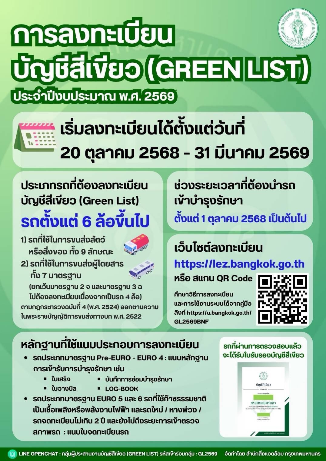 ทั้งนี้ การที่ กทม. ขอความร่วมมือผู้ประกอบการที่มีรถตั้งแต่ 6 ล้อขึ้นไปทั้งรถบรรทุกและรถโดยสารลงทะเบียนบัญชีสีเขียว (Green List) เพื่อควบคุมมลพิษอากาศ โดยเฉพาะฝุ่น PM2.5 รวมถึงช่วยให้รถได้รับการดูแลเครื่องยนต์ให้สามารถทำงานได้อย่างเต็มประสิทธิภาพ ซึ่งจะช่วยประหยัดการใช้น้ำมันเชื้อเพลิงได้อีกทางหนึ่ง