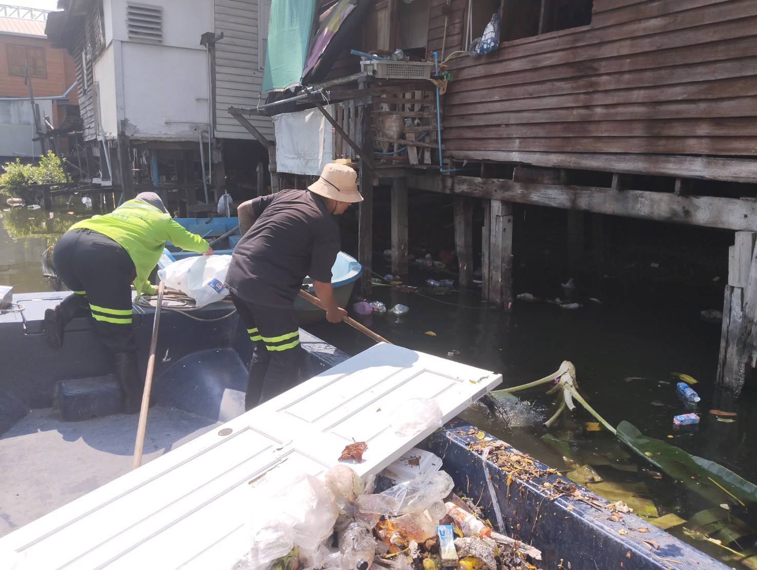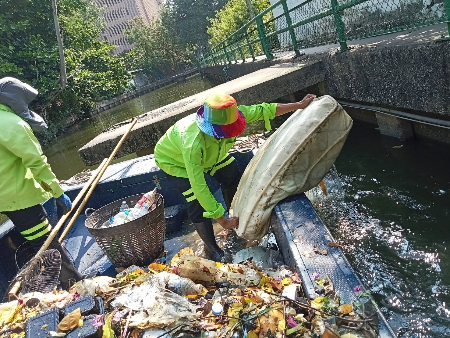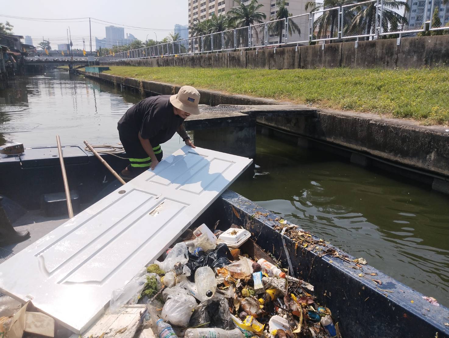 เจ้าหน้าที่ ตักขยะวัชพืชแพดักขยะหน้า ปตร.แสนเลิส แพดักขยะช่วงข้างวัดมักกะสัน พื้นที่เขตวัฒนา 5 เมษายน 2026