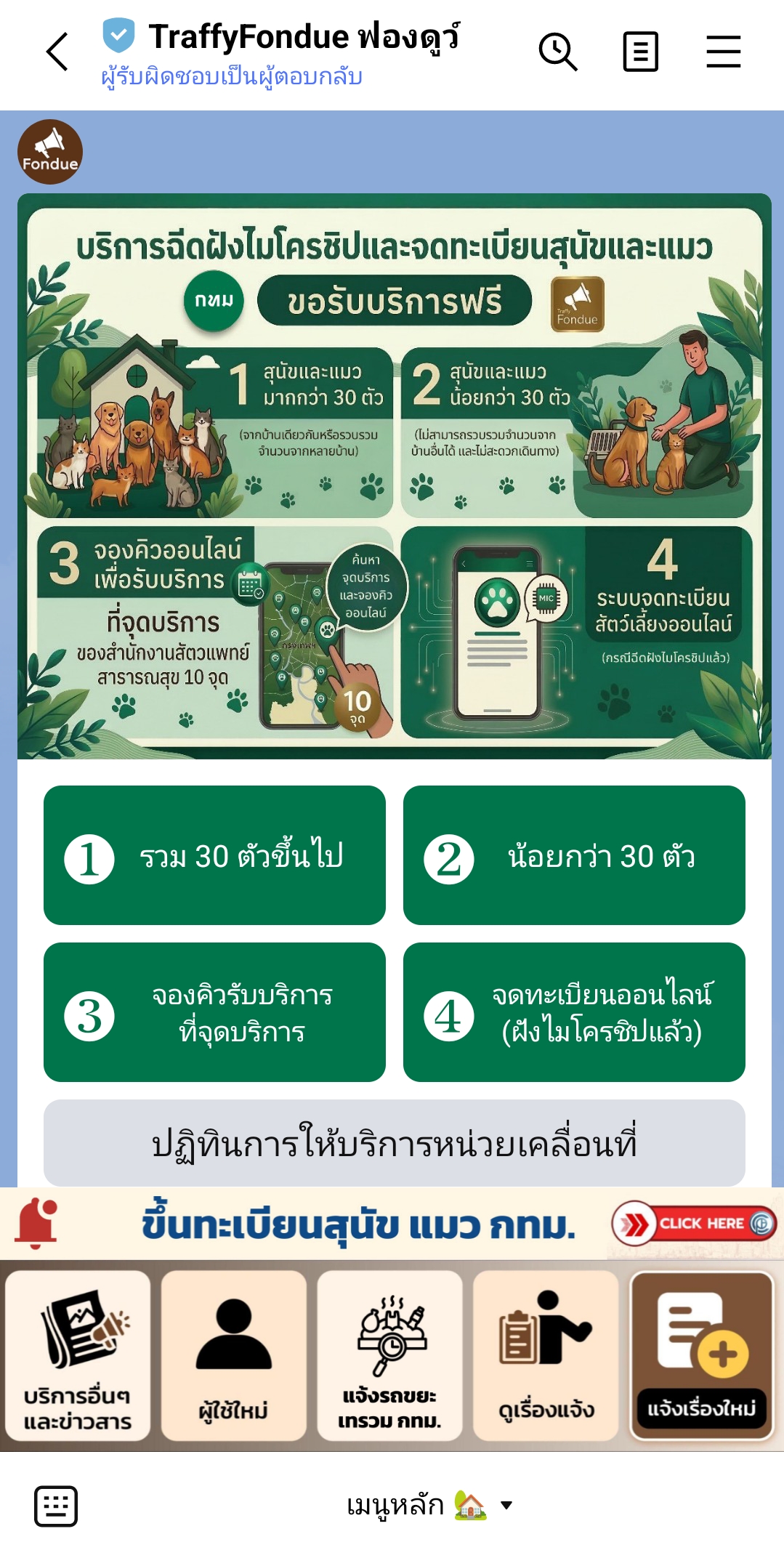 (1 เม.ย. 69) นายเอกวรัญญู อัมระปาล โฆษกของกรุงเทพมหานคร เปิดเผยว่า กรุงเทพมหานครได้เพิ่มช่องทางอำนวยความสะดวกแก่ประชาชนในการขอรับบริการฉีดฝังไมโครชิปและจดทะเบียนสุนัข–แมว ผ่าน Traffy Fondue ซึ่งจะทำให้ประชาชนสามารถใช้บริการได้สะดวก รวดเร็ว รวมถึงสามารถติดตามสถานะได้ โดยเปิดให้แจ้งขอรับบริการตั้งแต่วันที่ 1 เมษายน 2569 ส่วนการให้บริการเชิงรุกจะเริ่มออกหน่วยสัตวแพทย์เคลื่อนที่ตั้งแต่วันที่ 21 เมษายน 2569 เป็นต้นไป