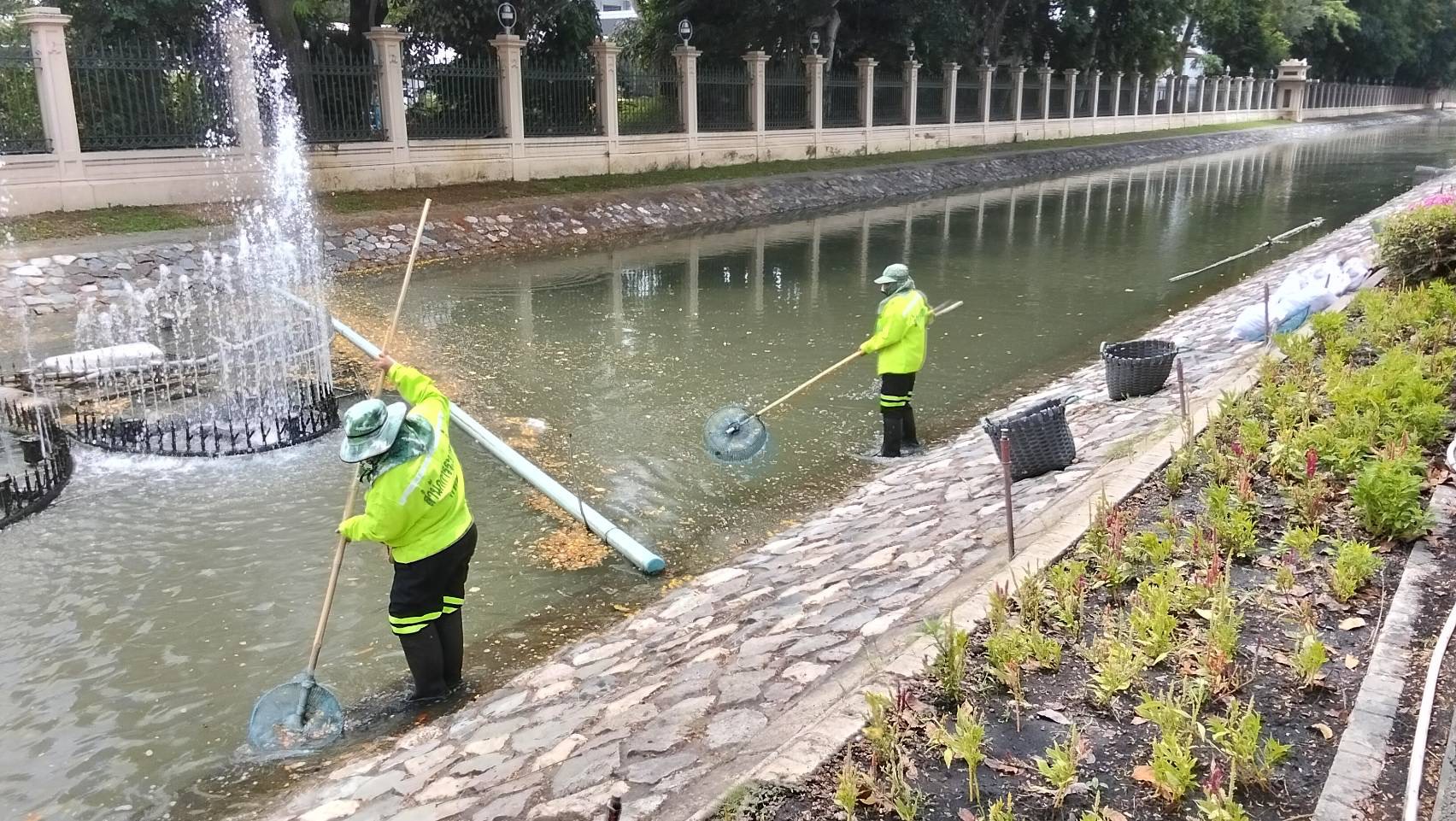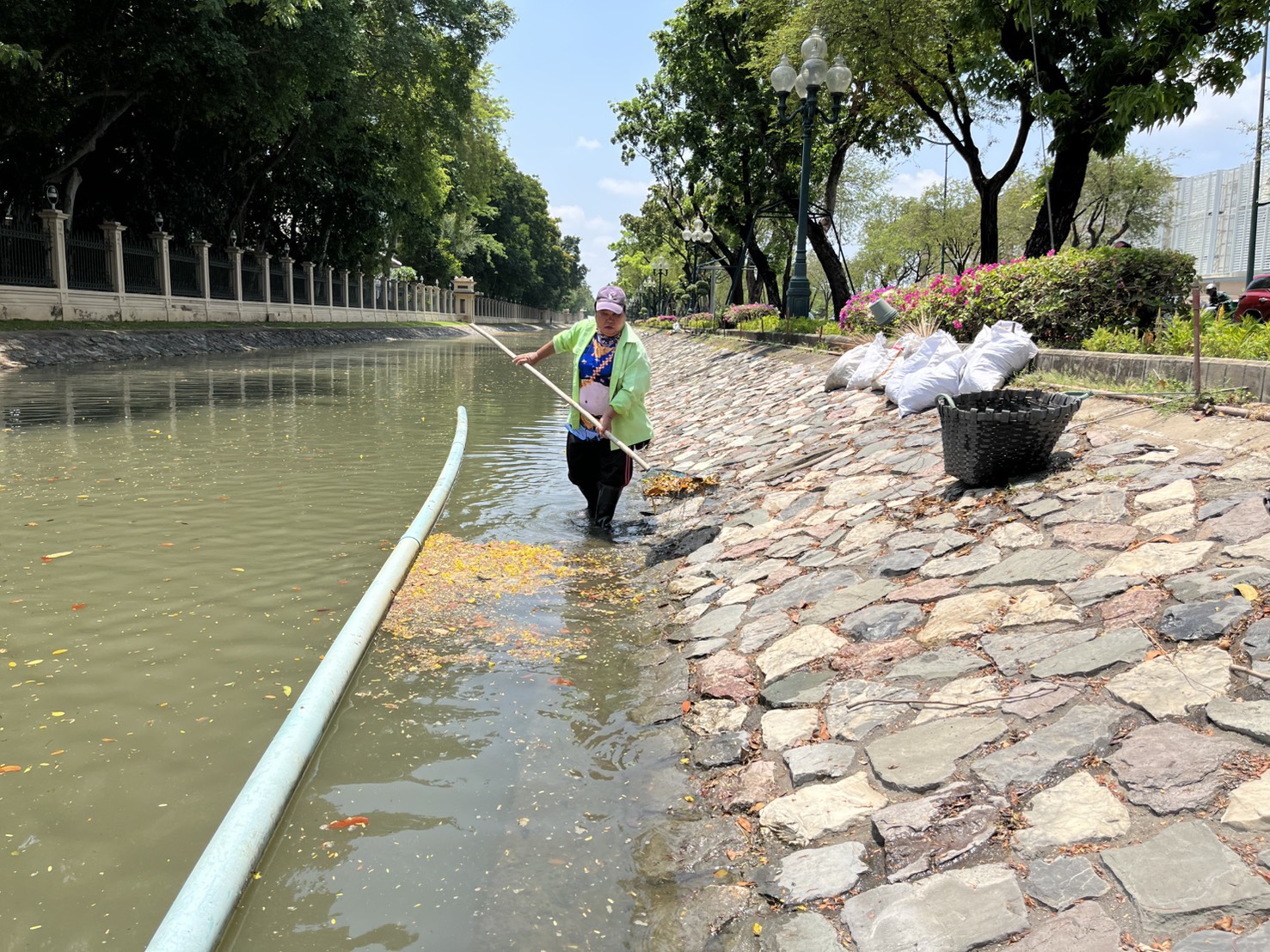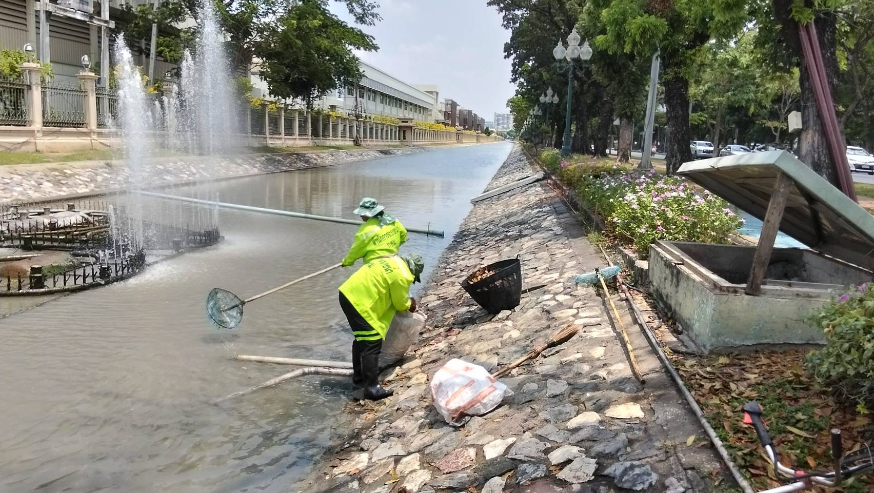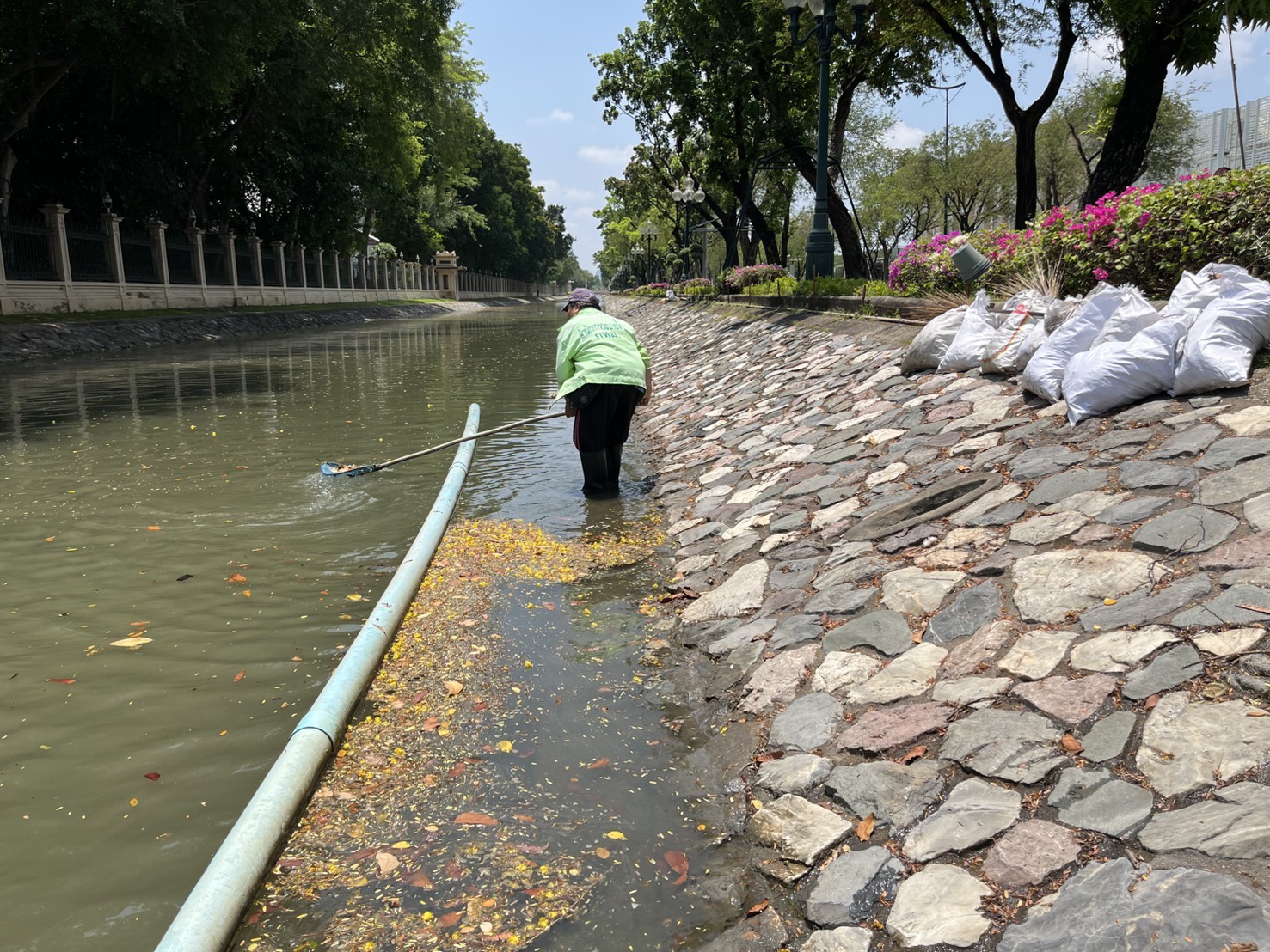 เจ้าหน้าที่ ดำเนินการตักใบไม้กำจัดวัชพืชคูน้ำรอบพระราชวังสวนจิตรลดา พื้นที่เขตดุสิต
