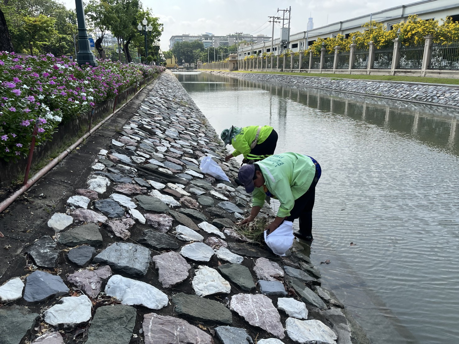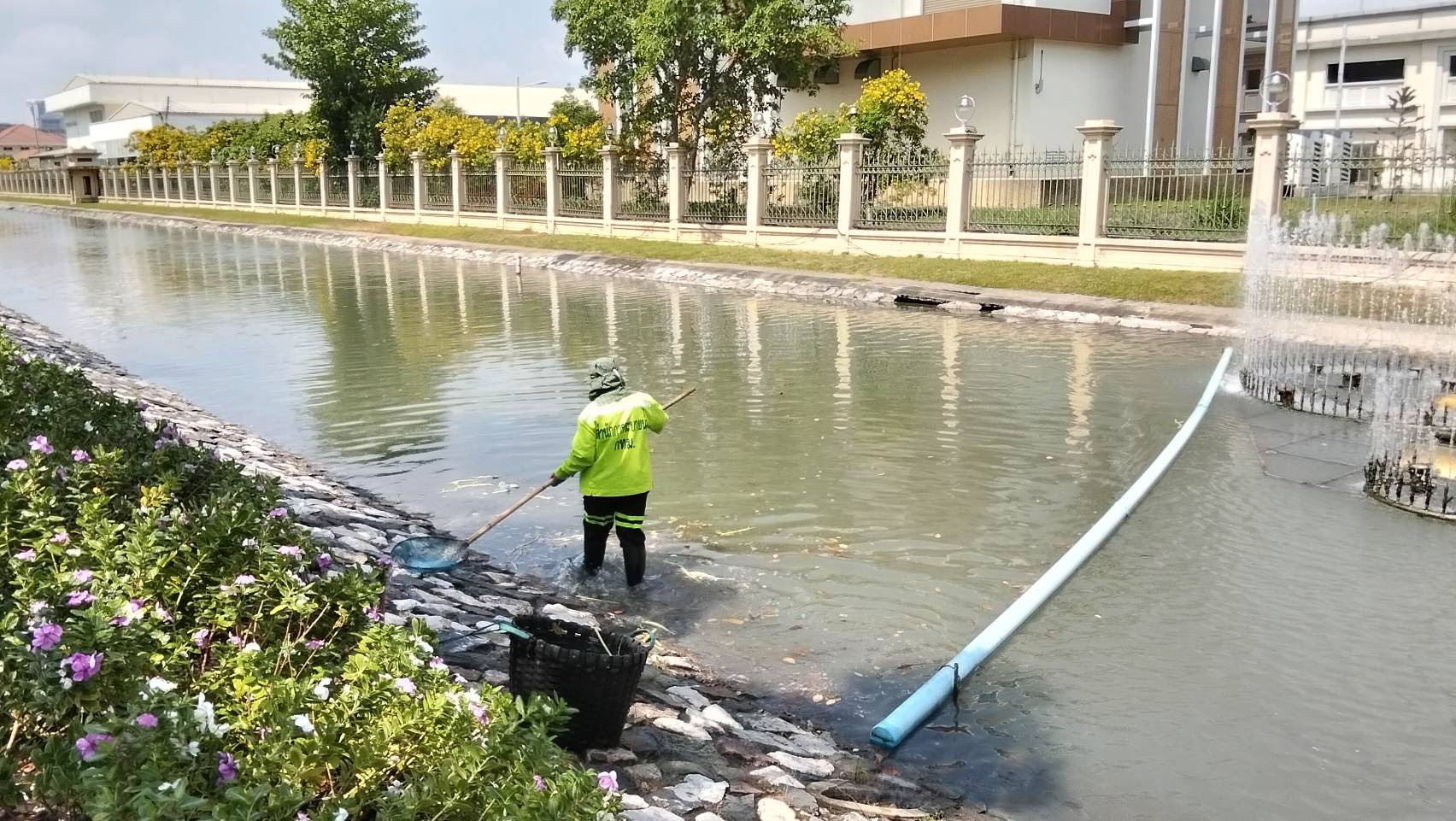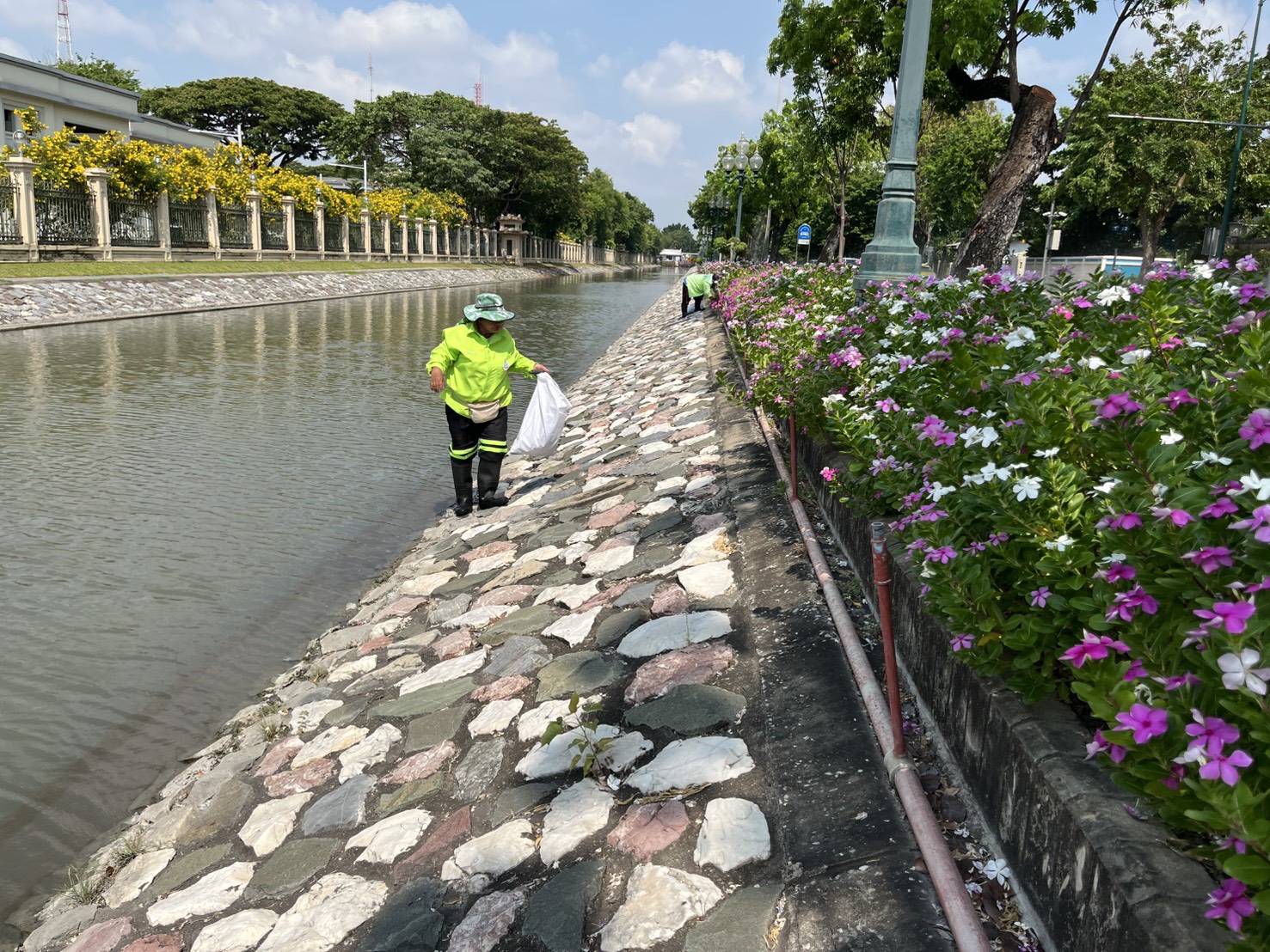 เจ้าหน้าที่ ดำเนินการตักใบไม้กำจัดวัชพืชคูน้ำรอบพระราชวังสวนจิตรลดา พื้นที่เขตดุสิต