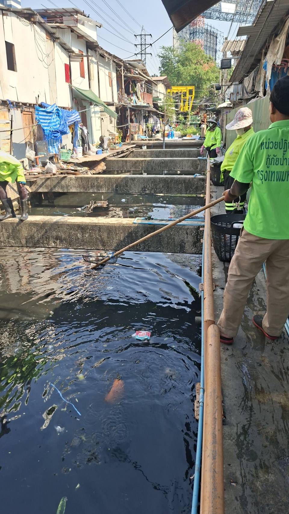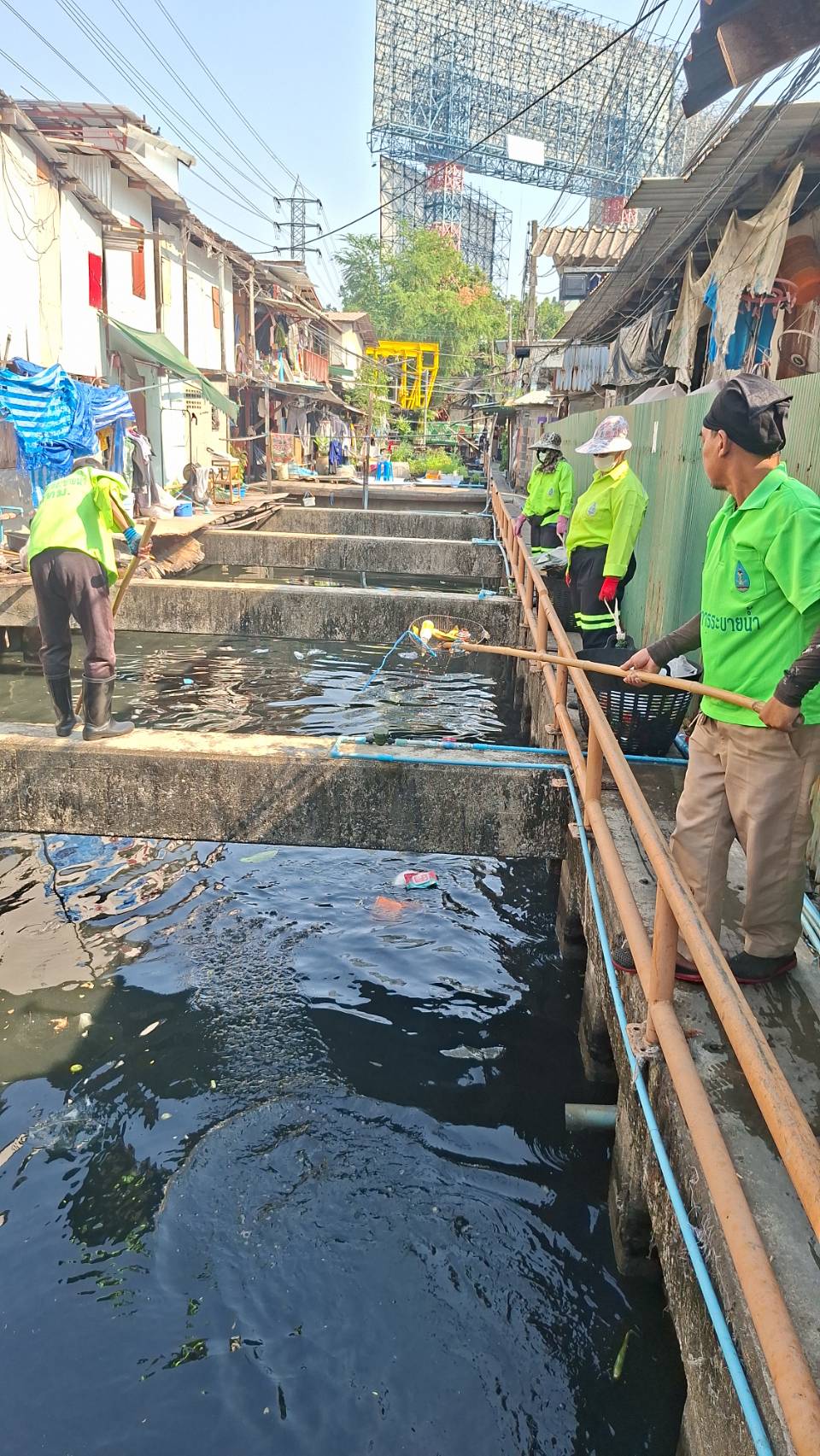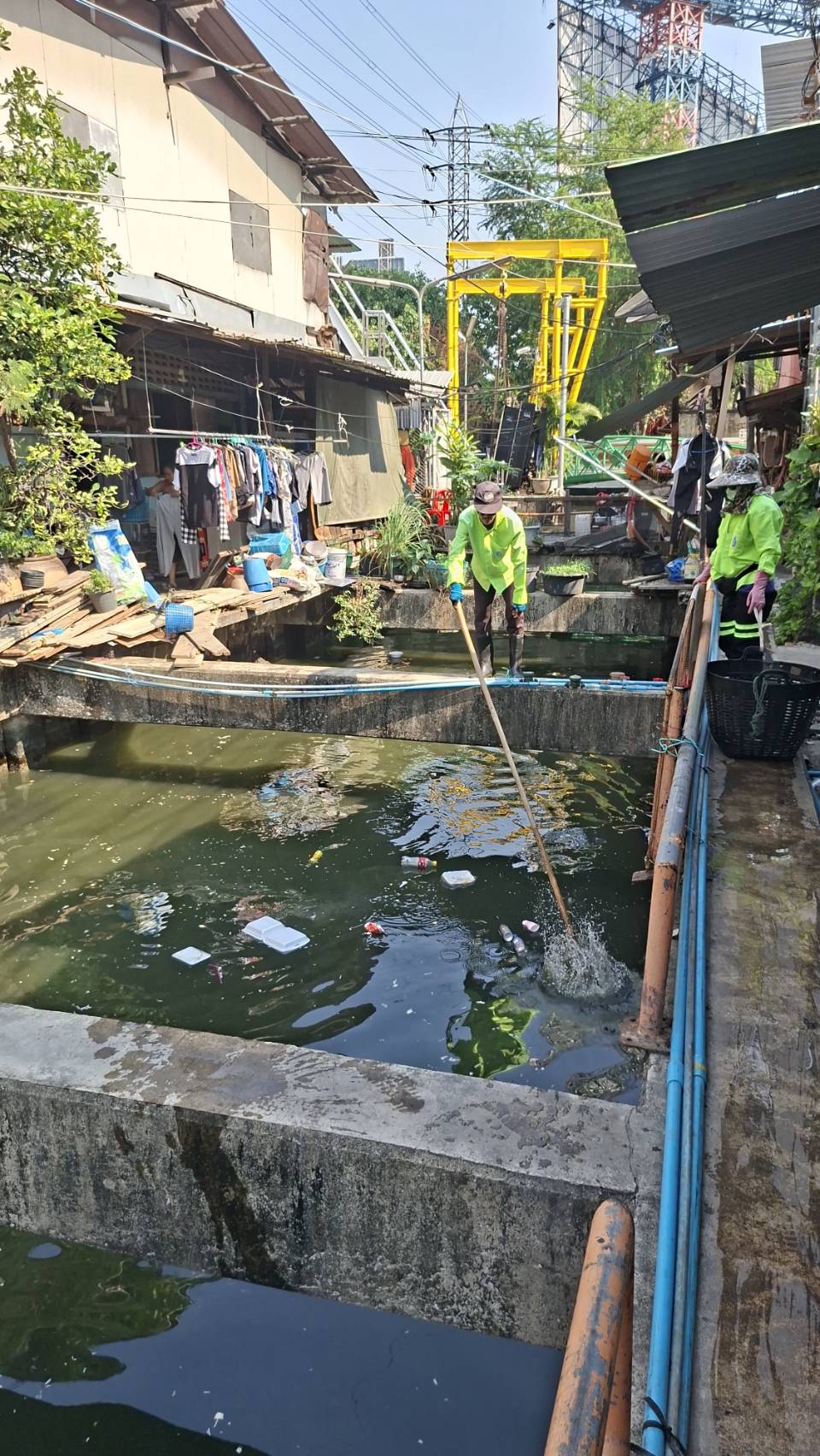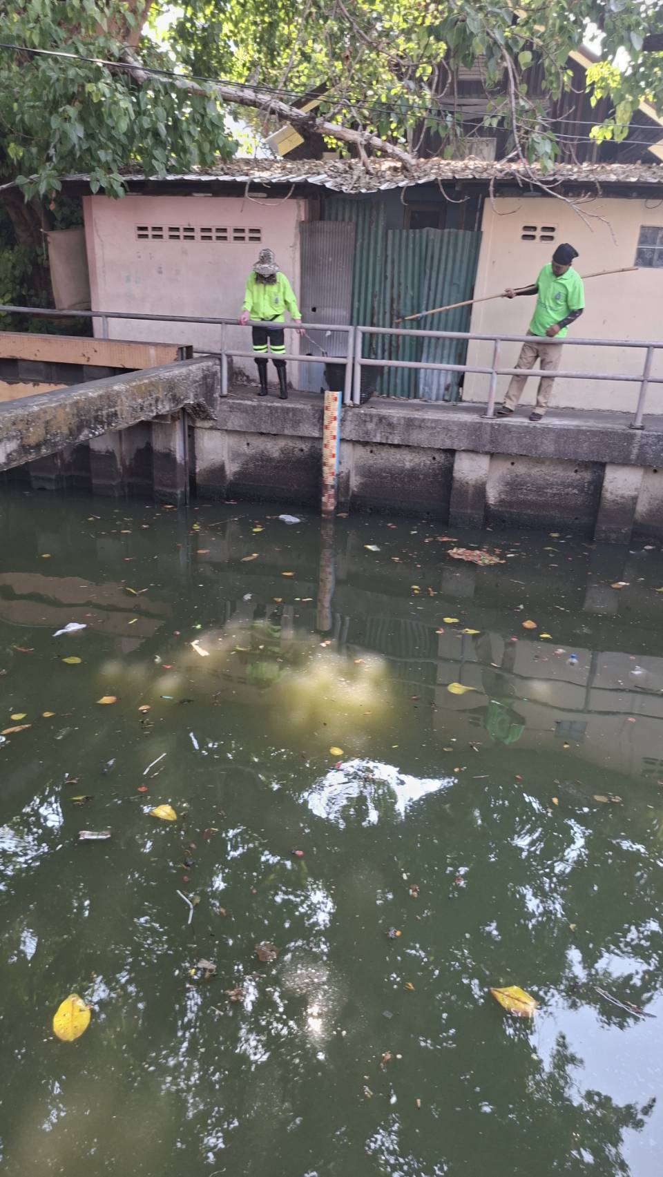 เจ้าหน้าที่ ตักขยะวัชพืชแพดักขยะหน้า ปตร.แสนเลิส แพดักขยะช่วงข้างวัดมักกะสัน พื้นที่เขตวัฒนา