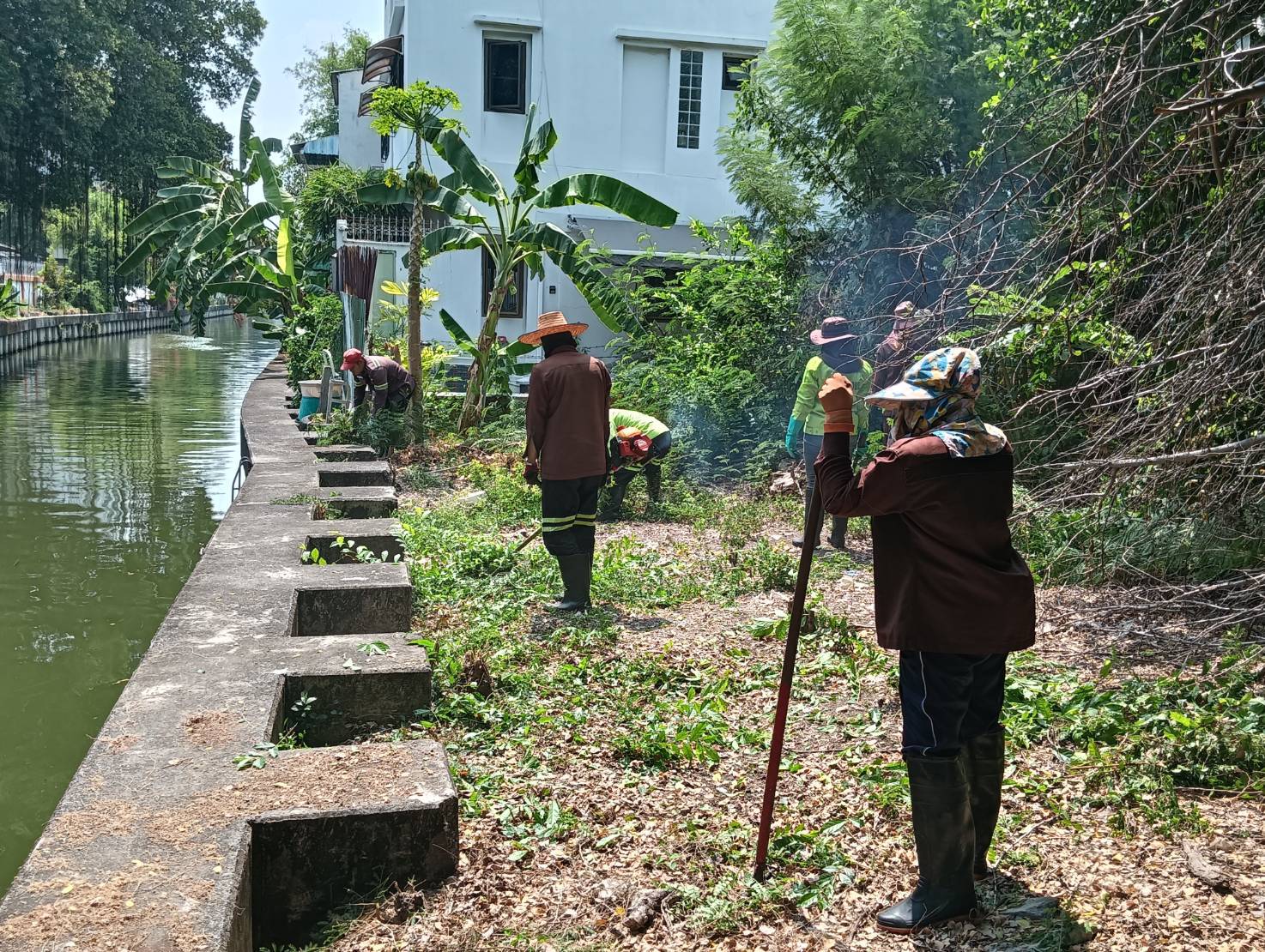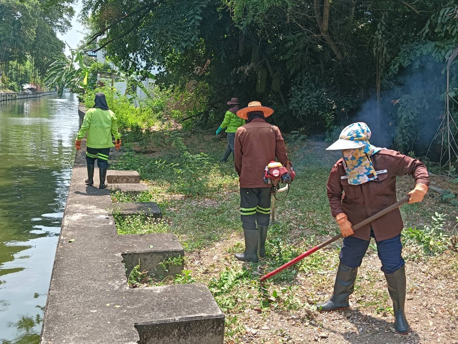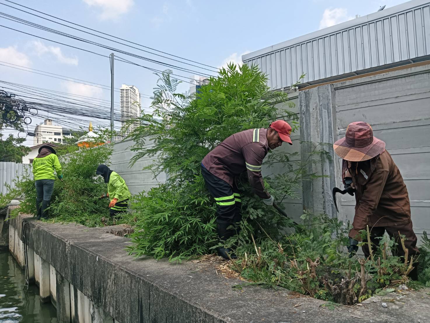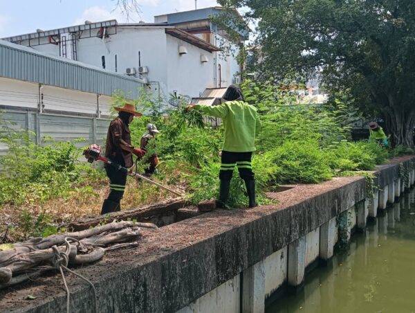 เจ้าหน้าที่ ตัดหญ้าริมขอบเขื่อนคลองสามเสน พื้นที่เขตห้วยขวาง