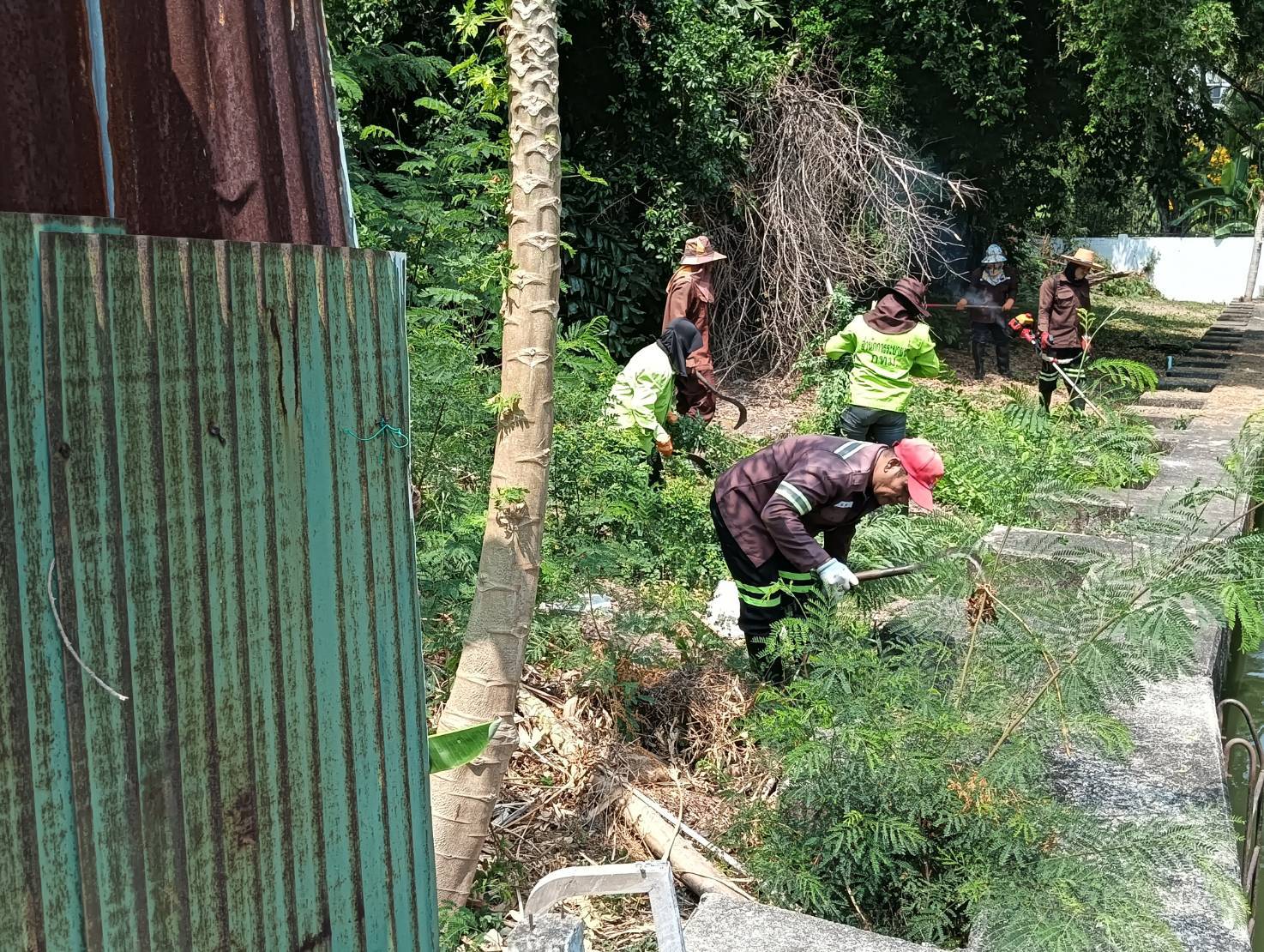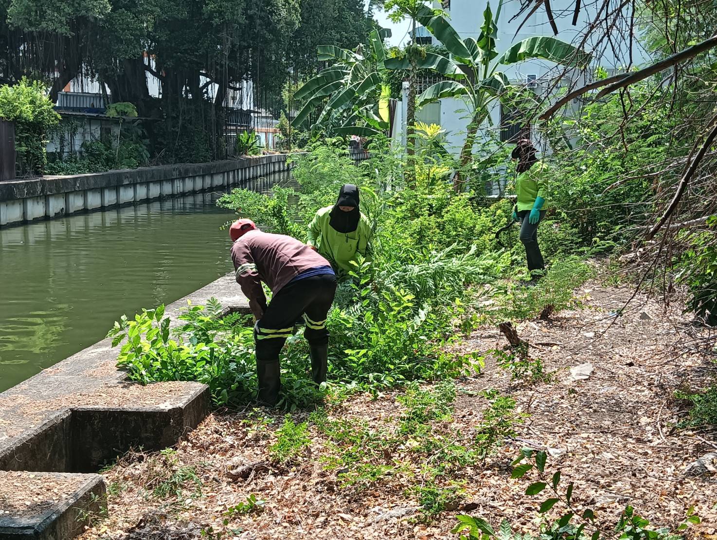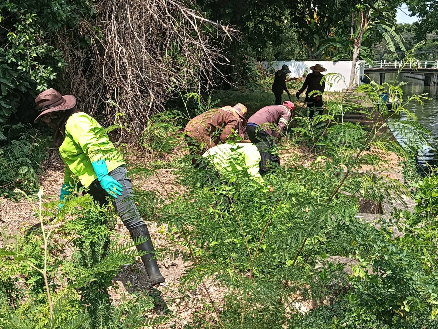 เจ้าหน้าที่ ตัดหญ้าริมขอบเขื่อนคลองสามเสน พื้นที่เขตห้วยขวาง