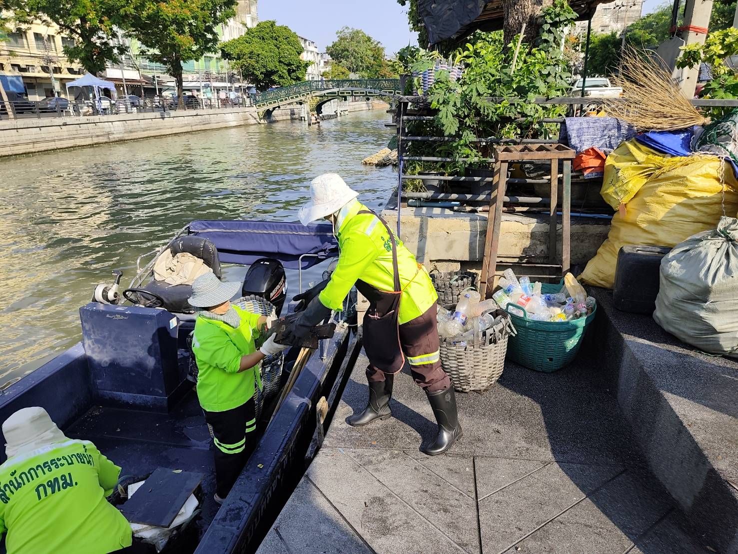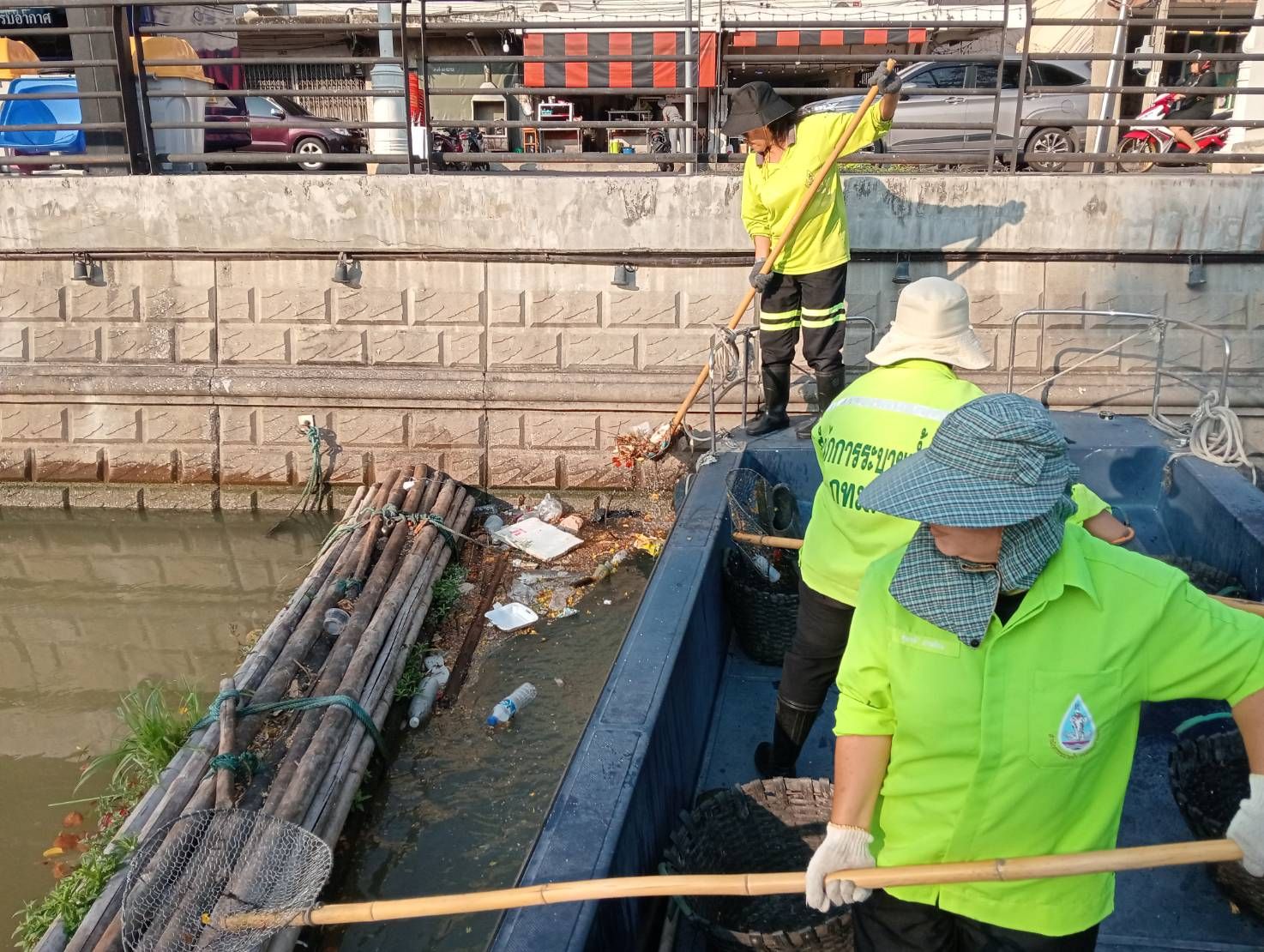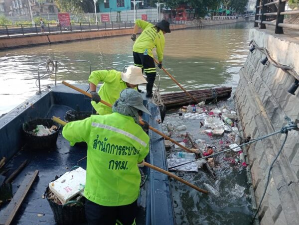 เจ้าหน้าที่ ตักเก็บขยะและวัชพืชคลองผดุงกรุงเกษมจาก ปตร. เทเวศร์ตลอดช่วงสะพานมัฆวานถึงสี่แยกมหานาค พื้นที่เขตดุสิต เขตพระนครเขตป้อมปราบศัตรูพ่าย