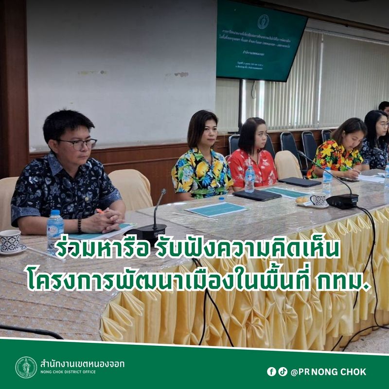 (10 เม.ย. 69) นางสาวยุวนุช นงพรมมา ผู้อำนวยการเขตหนองจอก มอบหมาย นายดำรงค์ฤทธิ์ พรหมณีวัฒน์ ผู้ช่วยผู้อำนวยการเขตหนองจอก พร้อมด้วย หัวหน้าฝ่าย และเจ้าหน้าที่ฝ่ายโยธา ร่วมประชุมเพื่อให้ข้อมูล และแสดงความคิดเห็นเกี่ยวกับการพัฒนาเมืองในพื้นที่เขตกรุงเทพมหานครชั้นนอก ด้านตะวันออก (เขตหนองจอกและเขตลาดกระบัง) โดยเจ้าหน้าที่จากสำนักวางผังและพัฒนาเมือง เข้ามารับทราบข้อมูล และรายละเอียดต่าง ๆ ที่เกี่ยวข้อง รวมถึงประเด็นปัญหาต่าง ๆ ของพื้นที่เขตหนองจอก เพื่อนำไปสู่การปฏิบัติอย่างเป็นรูปธรรม และให้เกิดประโยชน์สูงสุดต่อประชาชน ตามโครงการพัฒนาเมืองด้วยวิธีการจัดรูปที่ดินในพื้นที่เขตกรุงเทพมหานคร