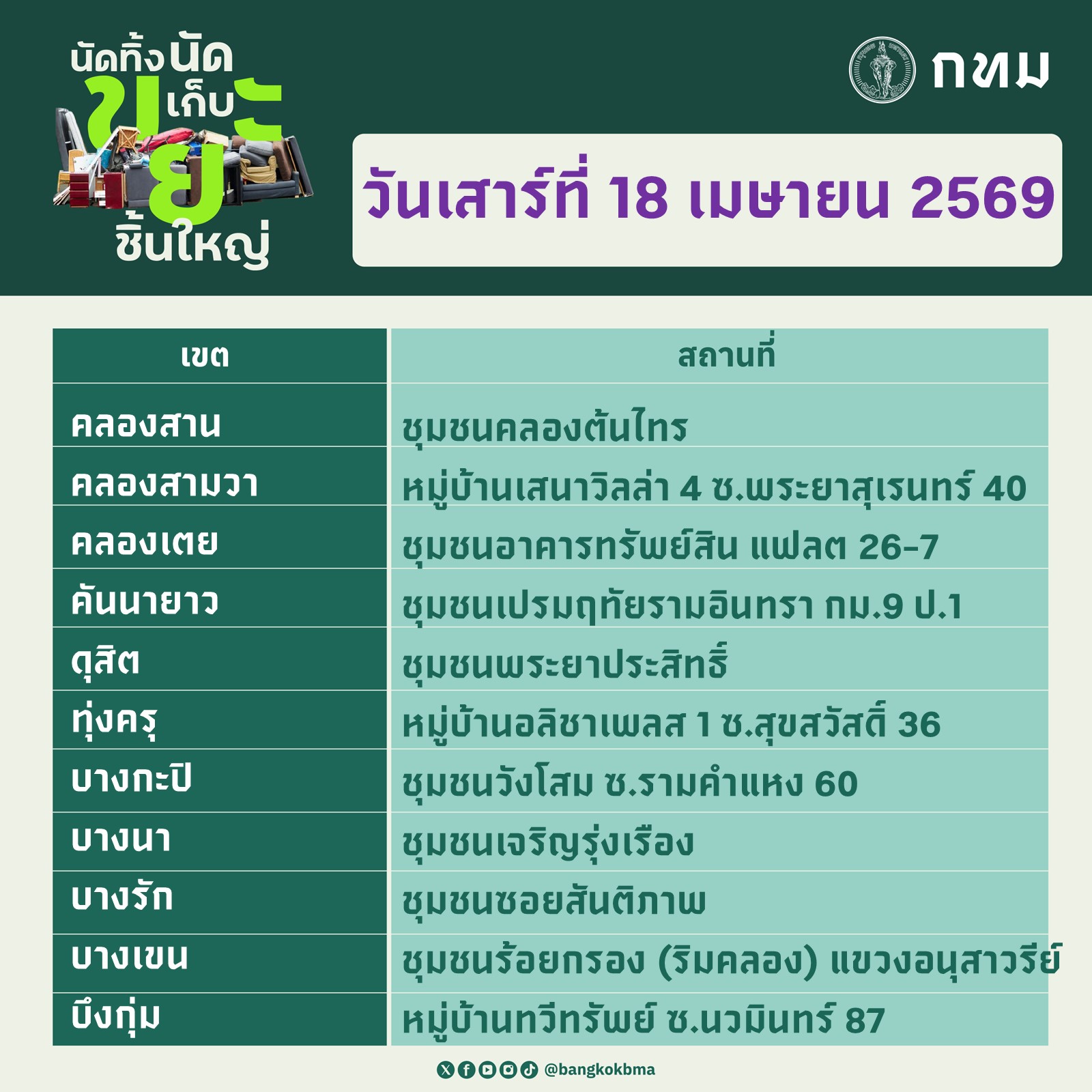 กทม.นัดทิ้ง นัดเก็บ ขยะชิ้นใหญ่ประจำวันที่ 18-19 เมษายน 2569