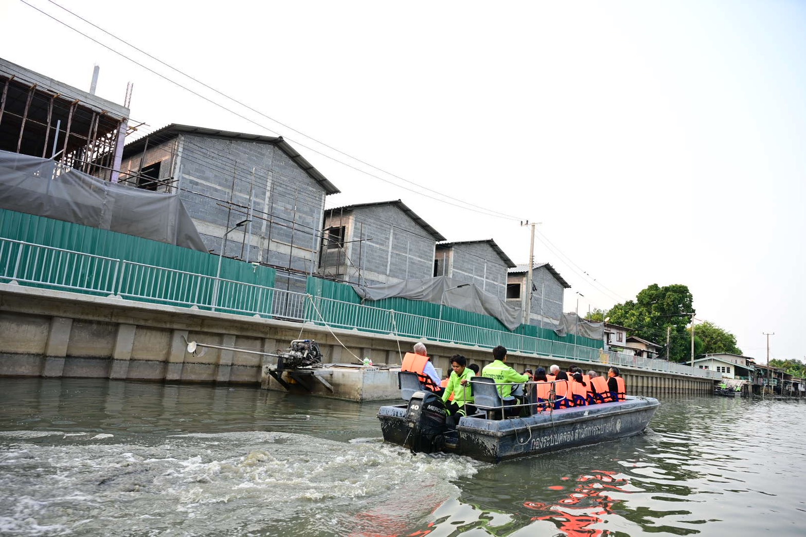 สำหรับการลงพื้นที่ในวันนี้ เป็นการติดตามความคืบหน้าการพัฒนาที่อยู่อาศัย โครงการบ้านมั่นคง และการก่อสร้างเขื่อนริมคลองเปรมประชากร ระยะทางประมาณ 5.5 กม. ทั้งสองฝั่งผ่านชุมชน 10 ชุมชน โดยโครงการมีเป้าหมายรวม 6,386 ครัวเรือน ใน 38 ชุมชน ปัจจุบัน ดำเนินการได้แล้ว 2,597 ครัวเรือน (คิดเป็น 41%) ครอบคลุม 25 ชุมชน สร้างเสร็จสมบูรณ์แล้ว 2,239 ครัวเรือน (คิดเป็น 35%) อยู่ระหว่างการก่อสร้าง 215 ครัวเรือน และกำลังเตรียมพื้นที่ก่อสร้างอีก 143 ครัวเรือน สำหรับส่วนที่เหลืออีก 3,789 ครัวเรือน อยู่ในขั้นตอนต่าง ๆ เช่น รอความชัดเจนเรื่องแนวเขตที่ดิน หรือรอการรื้อย้ายบ้านเดิมเพื่อเข้าพื้นที่