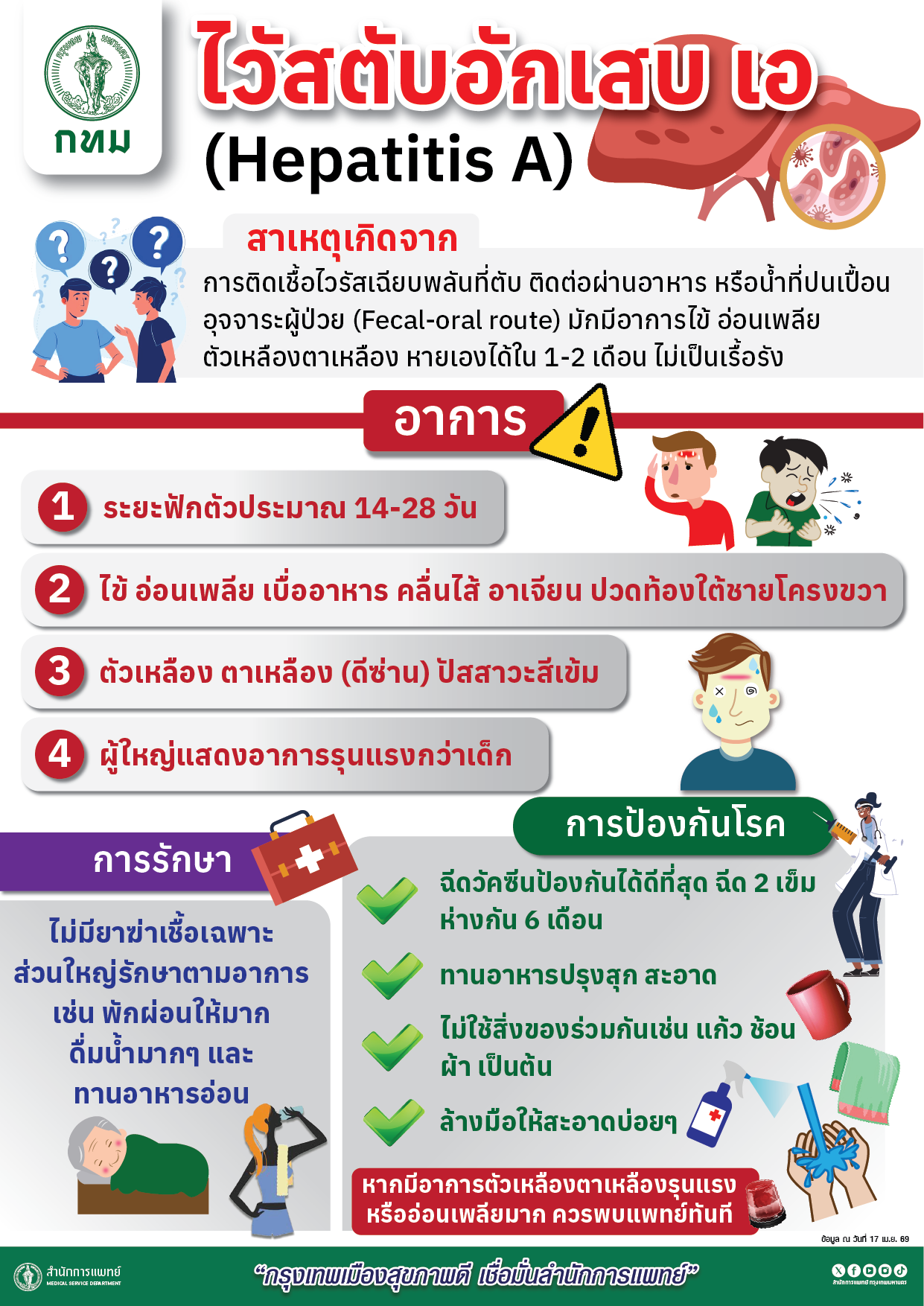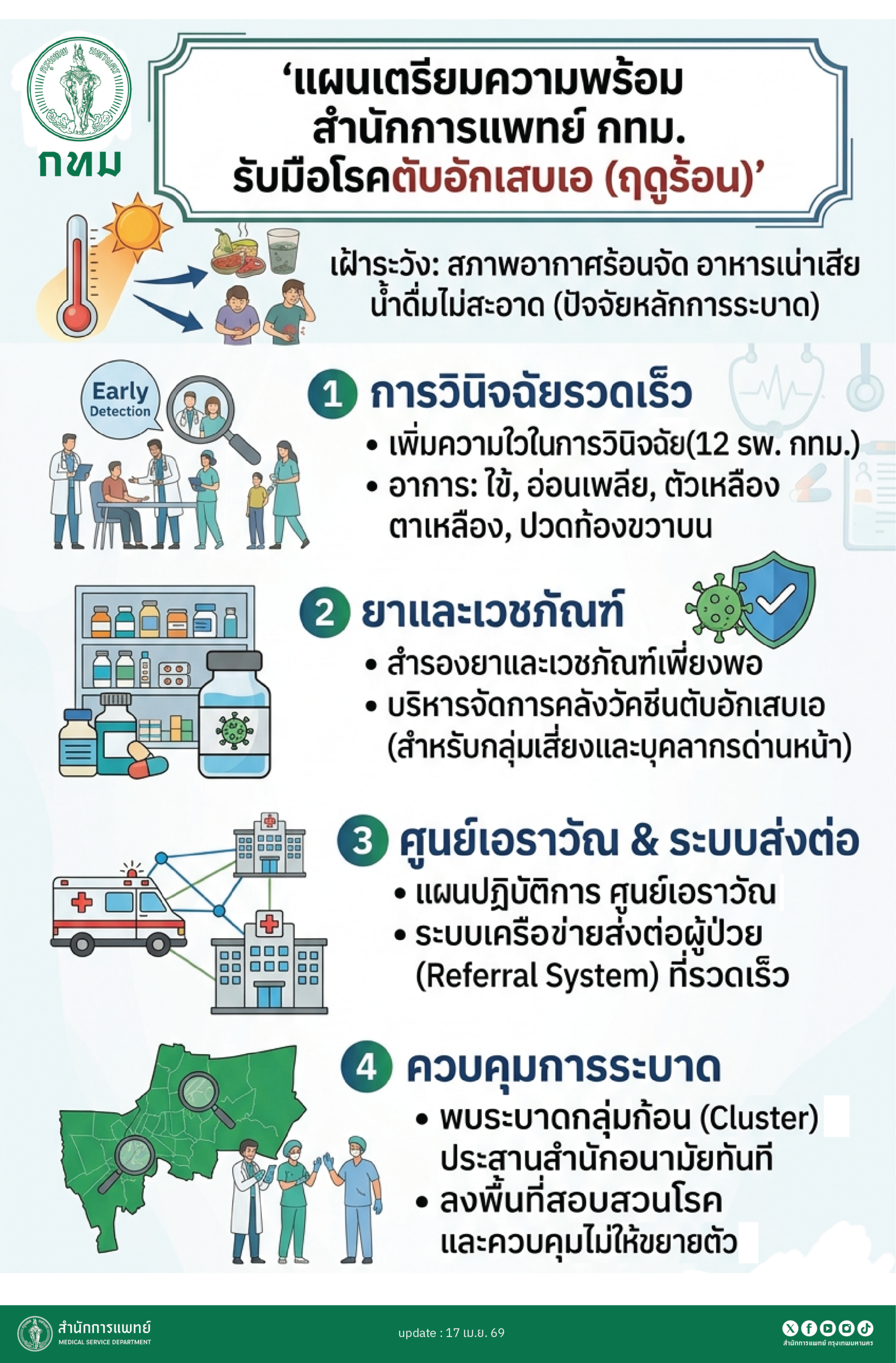 นายเกรียงไกร ตั้งจิตรมณีศักดา ผู้อำนวยการสำนักการแพทย์ (สนพ.) กทม. กล่าวกรณีกรมควบคุมโรคเตือนสถานการณ์ “โรคตับอักเสบเอ” ที่มีแนวโน้มเพิ่มขึ้นในช่วงฤดูร้อนว่า สนพ. ได้ติดตามสถานการณ์การแพร่ระบาดของโรคอย่างใกล้ชิด เนื่องจากสภาพอากาศที่ร้อนจัดส่งผลต่อการเน่าเสียของอาหารและคุณภาพน้ำดื่ม ซึ่งเป็นปัจจัยหลักของการแพร่ระบาด รวมทั้งได้เตรียมความพร้อมด้านบุคลากรทางการแพทย์ โดยกำชับให้แพทย์และพยาบาลในโรงพยาบาลสังกัด กทม. ทั้ง 12 แห่ง เพิ่มความรวดเร็วในการวินิจฉัย (Early Detection) โดยเฉพาะในผู้ป่วยที่มีอาการไข้ อ่อนเพลีย ตัวเหลือง ตาเหลือง หรือปวดท้องบริเวณด้านขวาบน พร้อมกันนี้ได้สำรองยาที่ใช้รักษาตามอาการและเวชภัณฑ์ที่จำเป็นไว้อย่างเพียงพอ รวมถึงบริหารจัดการคลังวัคซีนป้องกันตับอักเสบเอสำหรับกลุ่มเสี่ยงและบุคลากรด่านหน้า ขณะเดียวกันยังได้เตรียมแผนปฏิบัติการโดยศูนย์เอราวัณ รองรับสถานการณ์ฉุกเฉินผ่านระบบเครือข่ายส่งต่อผู้ป่วย (Referral System) ที่มีความรวดเร็ว หากพบการระบาดเป็นกลุ่มก้อน (Cluster) ในพื้นที่ใด จะประสานงานร่วมกับสำนักอนามัย (สนอ.) ลงพื้นที่สอบสวนโรคทันที เพื่อควบคุมวงจรการแพร่ระบาดไม่ให้ขยายวงกว้าง