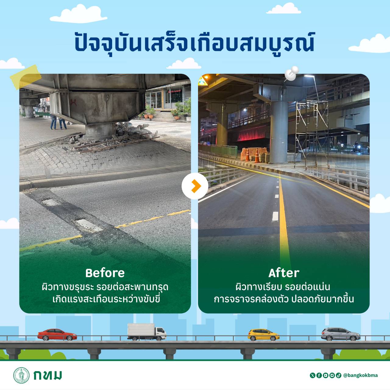 จากเดิมที่พื้นผิวชำรุด รอยต่อสะพานทรุด ทำให้เกิดแรงสั่นสะเทือนและการจราจรไม่คล่องตัว