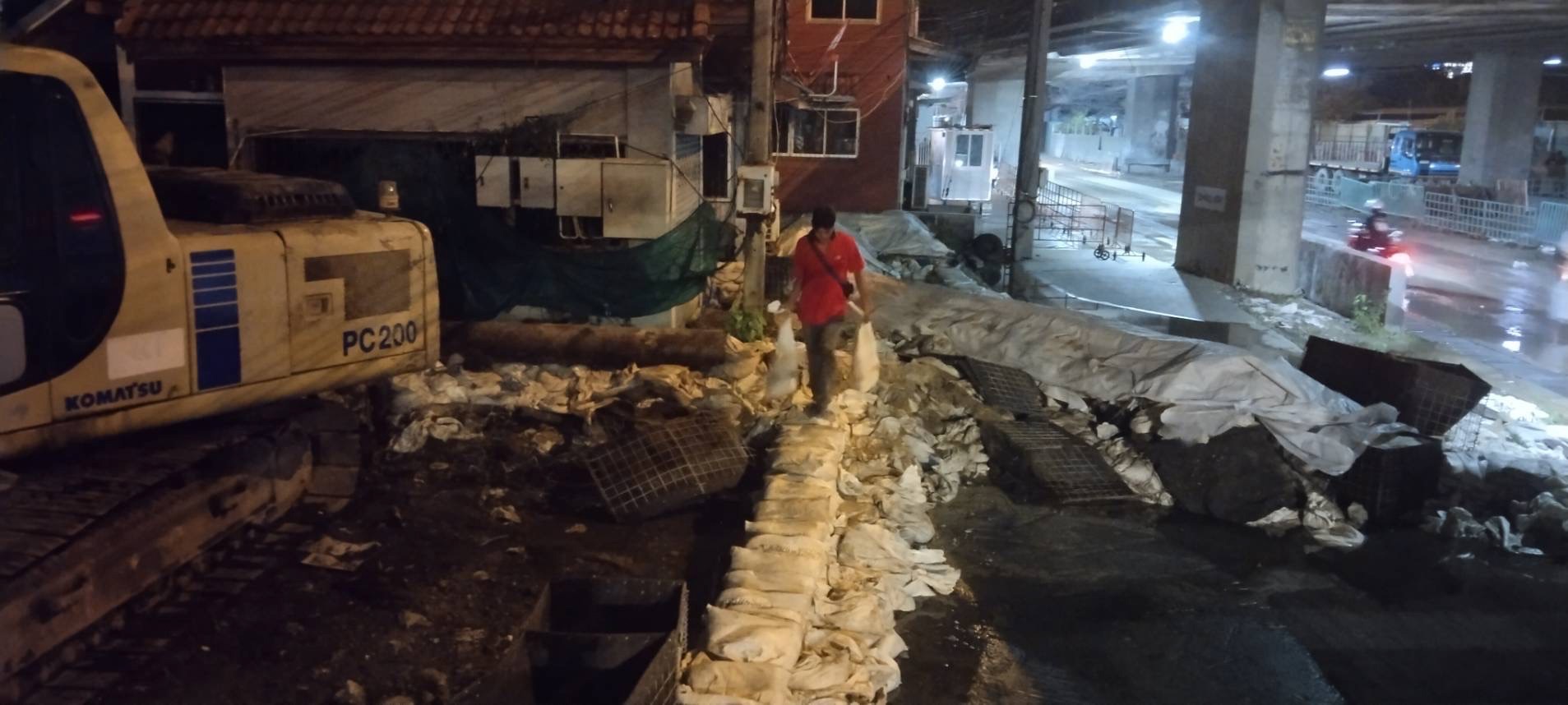 นายแหวน เพ็ชรตะกั่ว ผู้ช่วยผู้อำนวยการเขตคลองเตย รักษาราชการแทนผู้อำนวยการเขตคลองเตย กล่าวว่า สำนักงานเขตฯ ตรวจสอบแล้วพบว่า บริเวณสถานีสูบน้ำพระโขนง เบื้องต้นมีบ้านเรือนประชาชนได้รับผลกระทบ 8 หลังคาเรือน ปัจจุบันระดับน้ำได้ลดลงกลับสู่สภาวะปกติแล้ว ทั้งนี้ สำนักงานเขตฯ ได้ประสานแจ้ง สนน. เข้าดำเนินการแก้ไข ซ่อมแซมแนวพนังกั้นน้ำชั่วคราว และพิจารณาเยียวยาประชาชนผู้ได้รับผลกระทบ ขณะนี้อยู่ระหว่างการดำเนินการ ส่วนถนนทางรถไฟสายเก่าบริเวณท่าทราย เกิดเหตุแนวกระสอบทรายชั่วคราวซึ่งอยู่ระหว่างการก่อสร้างเขื่อนป้องกันน้ำท่วมชำรุดเสียหาย ทำให้น้ำไหลเข้าท่วมถนนจากคลองพระโขนงถึงกรมส่งเสริมอุตสาหกรรม ระยะทางประมาณ 200 เมตร ระดับน้ำสูงประมาณ 30–50 เซนติเมตร ส่งผลให้การจราจรติดขัด มาตรการเบื้องต้น สำนักงานเขตฯ ได้ส่งหน่วย BEST ดำเนินการเสริมกระสอบทรายเพื่อป้องกันน้ำไหลลงสู่ถนน ทำให้ระดับน้ำลดลงและกลับสู่ภาวะปกติเมื่อเวลาประมาณ 22.00 น. และประสานแจ้ง สนน. เพื่อพิจารณาดำเนินการแก้ไขต่อไป