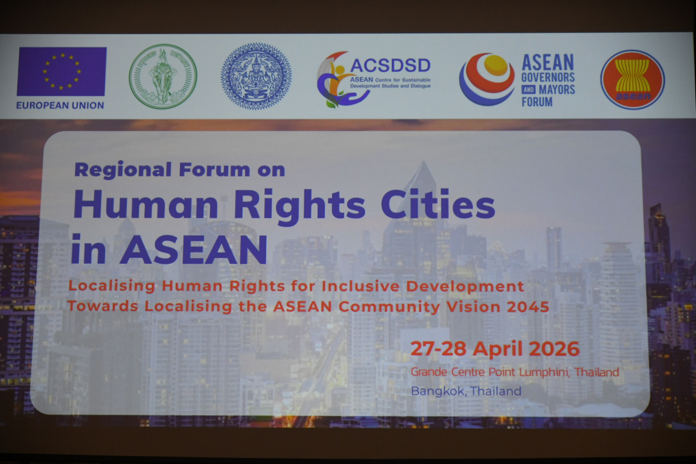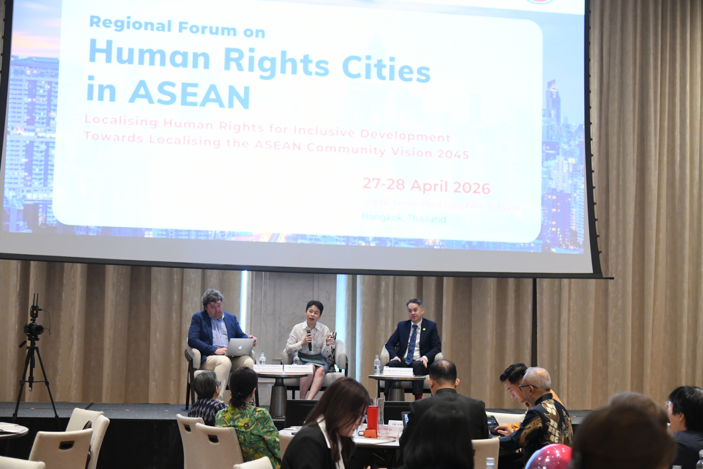 ในการนี้ ผศ. ดร. ภาณุภัทร จิตเที่ยง ผู้แทนประเทศไทยประจำคณะกรรมการระหว่างรัฐบาลอาเซียนด้านสิทธิมนุษยชน ดร. เบอร์นาเดีย อิราวาติ จันทราเทวี เลขาธิการใหญ่การประชุมผู้นำเมืองอาเซียน นางสาวภาสพร สังฆสุบรรณ์ ผู้อำนวยการบริหารศูนย์อาเซียนเพื่อการศึกษาและการหารือด้านการพัฒนาที่ยั่งยืน ร่วมกล่าวต้อนรับ