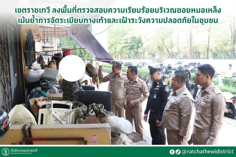 นายอภิชาต แสนมาโนช ผู้อำนวยการเขตราชเทวี มอบหมาย นายสรรเสริญ เรืองฤทธิ์ ผู้ช่วยผู้อำนวยการเขต นำทีมลงพื้นที่สำรวจความเป็นระเบียบเรียบร้อยบริเวณซอยหมอเหล็ง โดยเน้นย้ำเจ้าหน้าที่ในเรื่องของการดูแลความสะอาดตลอดเส้นทางสัญจรและลำรางระบายน้ำบริเวณใกล้เคียง พร้อมทั้งตรวจสอบการตั้งวางสิ่งของบนทางเท้า ซึ่งพบว่ามีบางจุดที่มีการตั้งวางสิ่งของกีดขวาง จึงได้เข้าไปพูดคุยและประชาสัมพันธ์ขอความร่วมมือให้เคลื่อนย้ายสิ่งของออกเพื่อให้ผู้ใช้ทางเท้าสามารถสัญจรได้อย่างสะดวก รวมถึงช่วยให้เจ้าหน้าที่สามารถเข้าดำเนินการกวาดทำความสะอาดพื้นที่ได้ง่ายยิ่งขึ้น