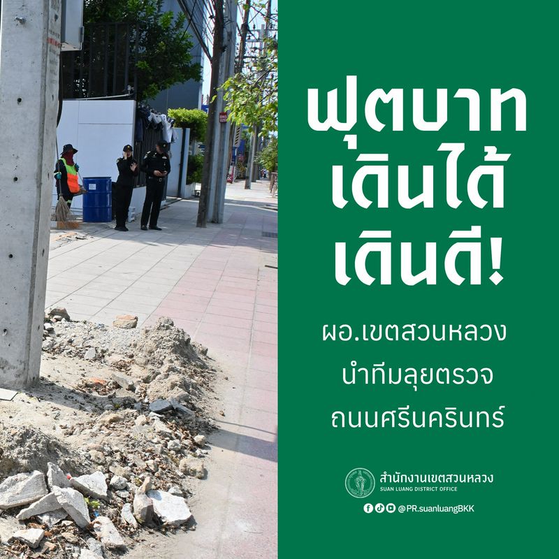 (27 เม.ย. 69) นายบัญชา สืบกระพัน ผู้อำนวยการเขตสวนหลวง นำทีมคณะผู้บริหารและเจ้าหน้าที่ที่เกี่ยวข้อง ลงพื้นที่เดินเท้าตรวจความเป็นระเบียบเรียบร้อยบริเวณ ถนนศรีนครินทร์ (ช่วงแยกศรีนุช – คลองตาสาด) เพื่อสำรวจปัญหาและจัดระเบียบพื้นที่สาธารณะให้ประชาชนสัญจรได้อย่างสะดวกและปลอดภัย