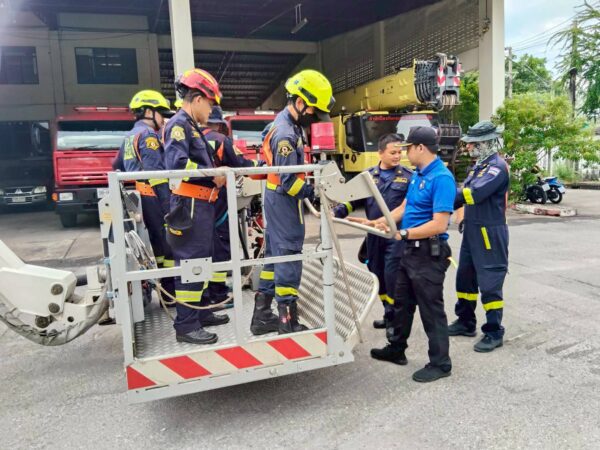 ดับเพลิงธนบุรี ฝึกการใช้และตรวจเช็คบำรุงรักษารถหอน้ำดับเพลิงพร้อมกระเช้า