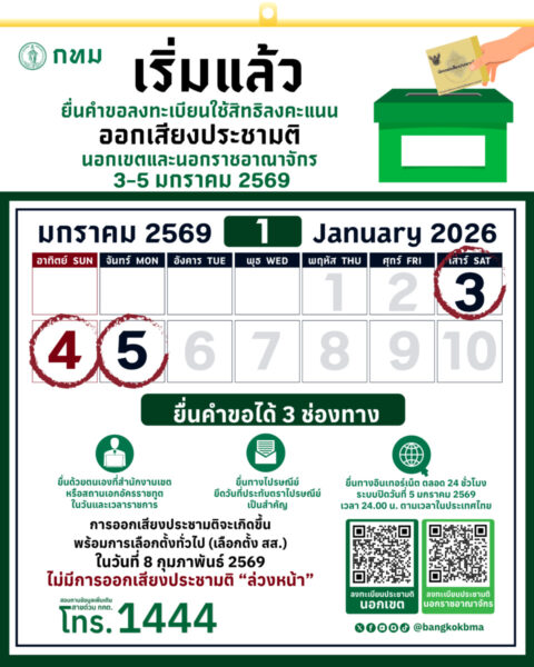 >>> กำหนดการสำคัญ• เปิดลงทะเบียนเลือกตั้งล่วงหน้า 20 ธ.ค. 2568 – 5 ม.